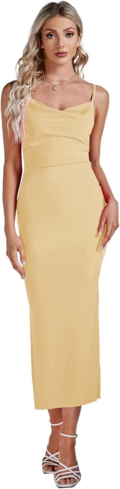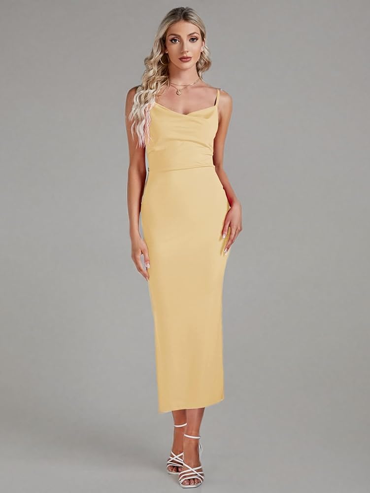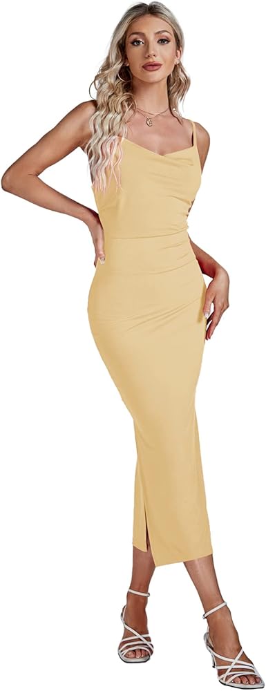 - Feature: Spaghetti strap, sleeveless, little cowl neck, midi length, split thigh, ruched front, backless, zipped back, ribbed knitted, pleated bodycon cocktail tube dress.