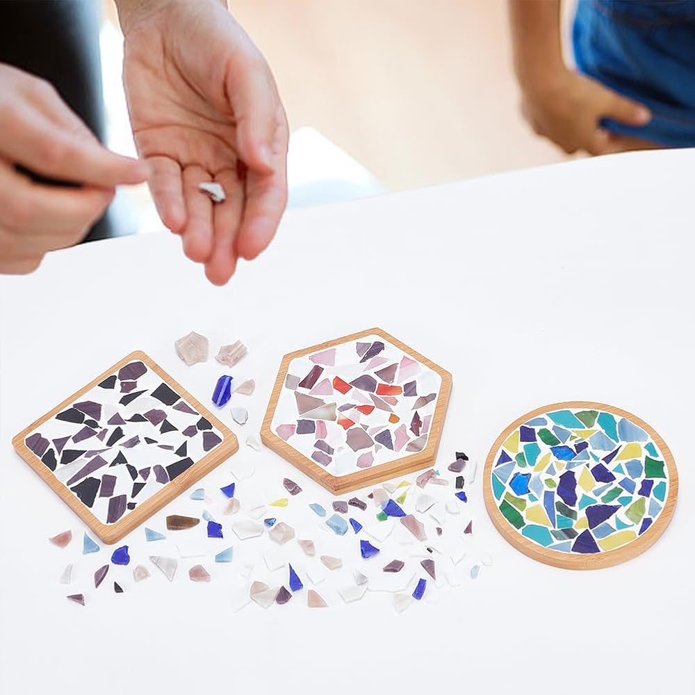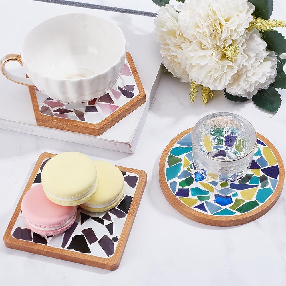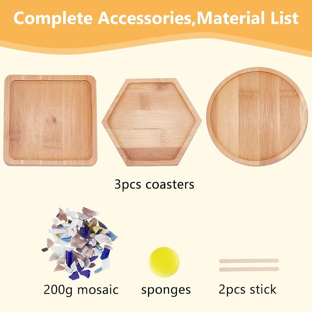 Mosaic Coaster Kit: This glass tile mosaic kit comes with craft material you need to create 3 mosaic coasters: 3pcs bamboo bases(3 shapes); mosaic tiles, 1pcs bead; 1pcs sponge and small wooden sticks. (glue and grout are NOT included).