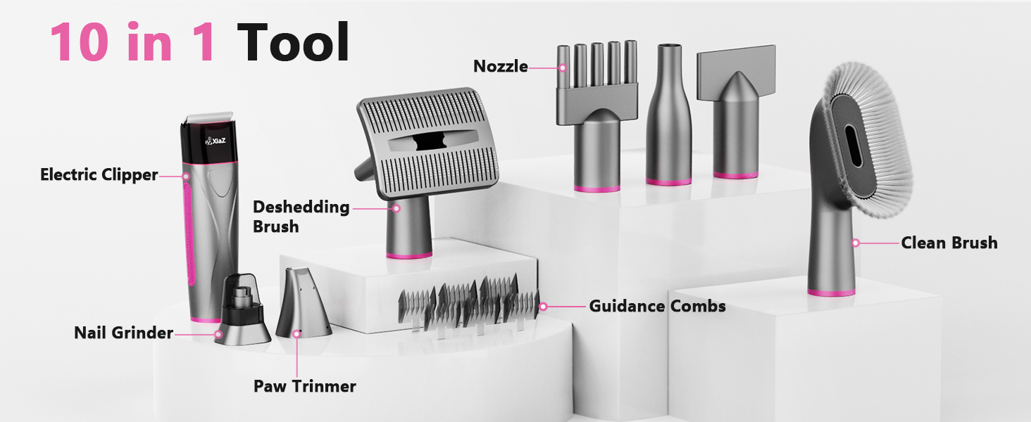 10 in 1 Pro Pet Grooming Kit: Our pet vacuum for dogs with specialized tools and attachments can help you groom your pet more efficiently and easier. The brush and the deshedding tool can help you remove tangles and knots, while the nozzle attachment can help you get into hard-to-reach areas, such as around your pet's eyes and ears. Electric clipper, dog paw trimmer and dog nail grinder provides excellent cutting. Cleaning brushs can be used for collecting pet hair falling on the carpet, sofa.