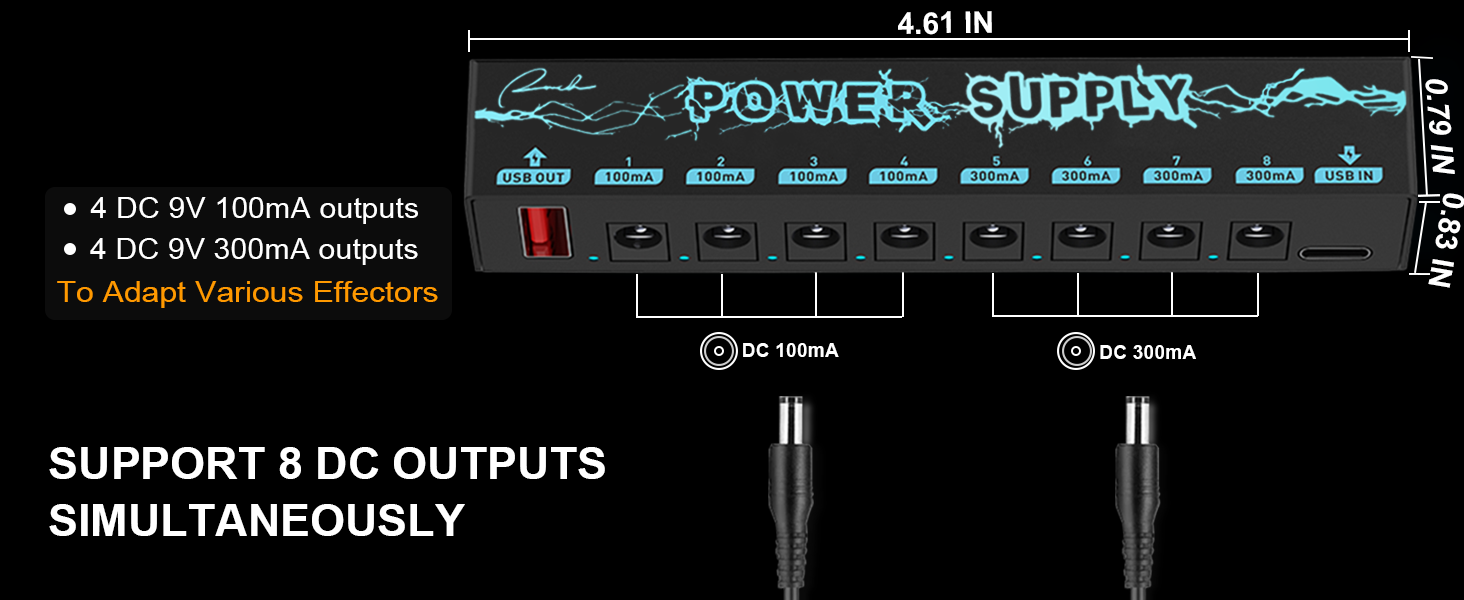 🎸 Multiple Power Outputs: Our 9 Volts guitar effects pedal power supply has 8 isolated power outputs (4 * 9V 300mA and 4 * 9V 100mA) for simultaneously powering up to 8 effect pedals, providing stabler and cleaner power with no noise or interference.
