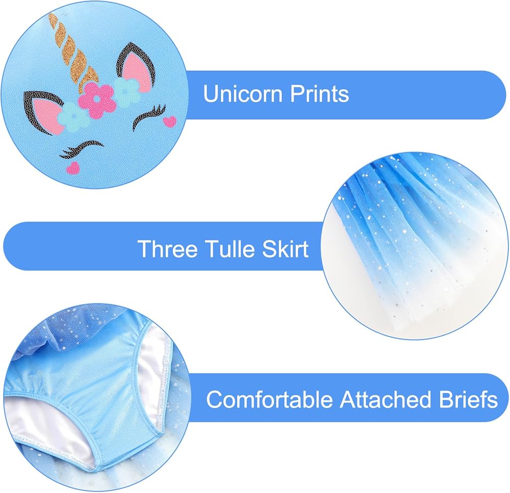 【Detail of Girls Ballet Outfits】Ruffle sleeve, unicorn prints, modest scoop neckline, attached briefs, crotch liner, high-waisted ballet dress outfit attached fairy chiffon skirt will make your little princess rotate flexibly without losing elegance.