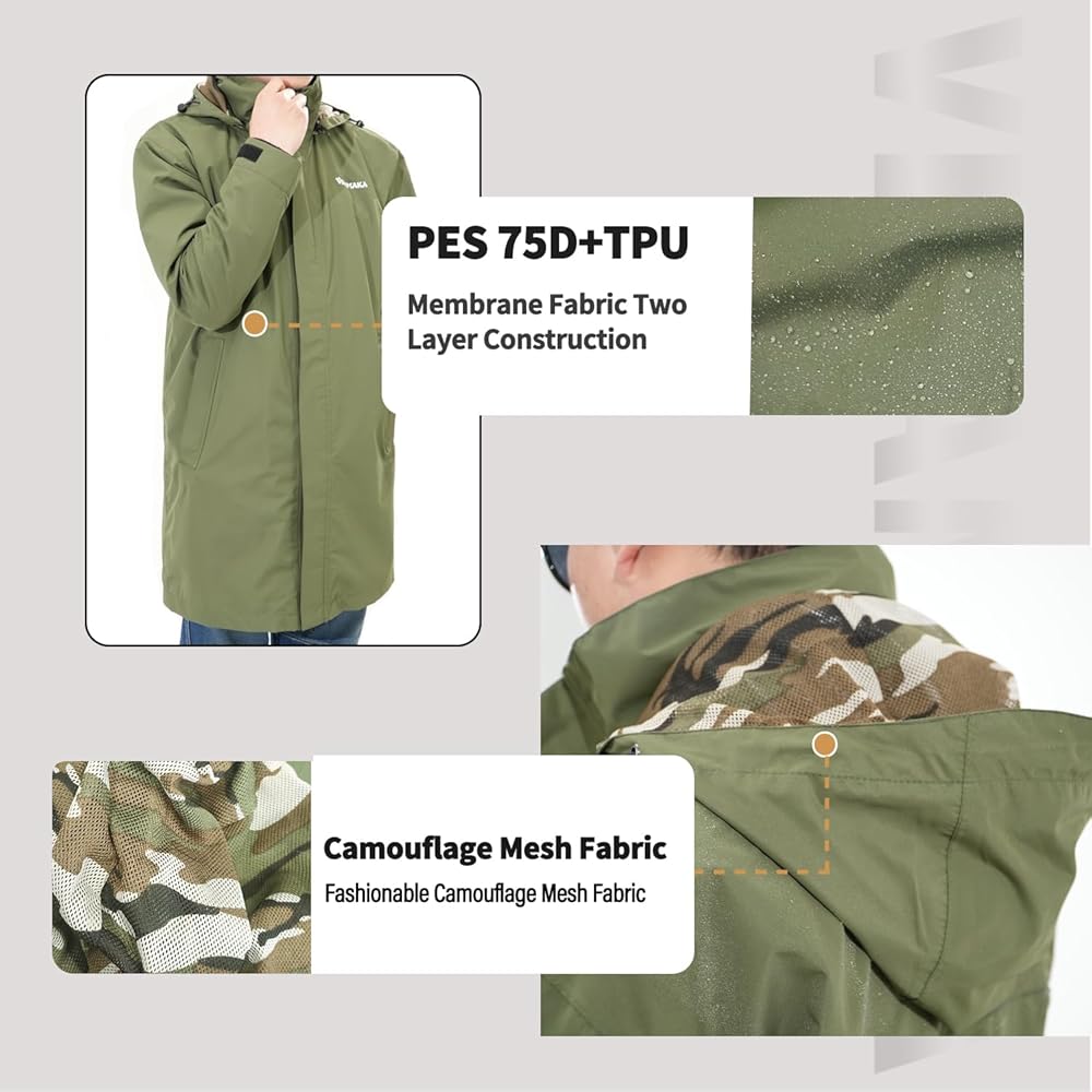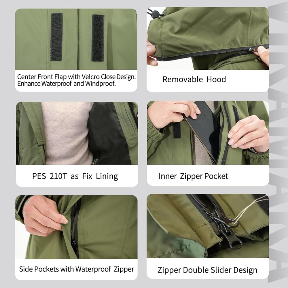 REMOVABLE and ADJUSTABLE HOOD: This raincoat for men is designed with removable windproof hood to ensure complete rain coverage, the windbreak stand-up collar and the elastic drawstring of hem can be adjusted to keep rain wind and cold from sneaking into the openings of your jacket.