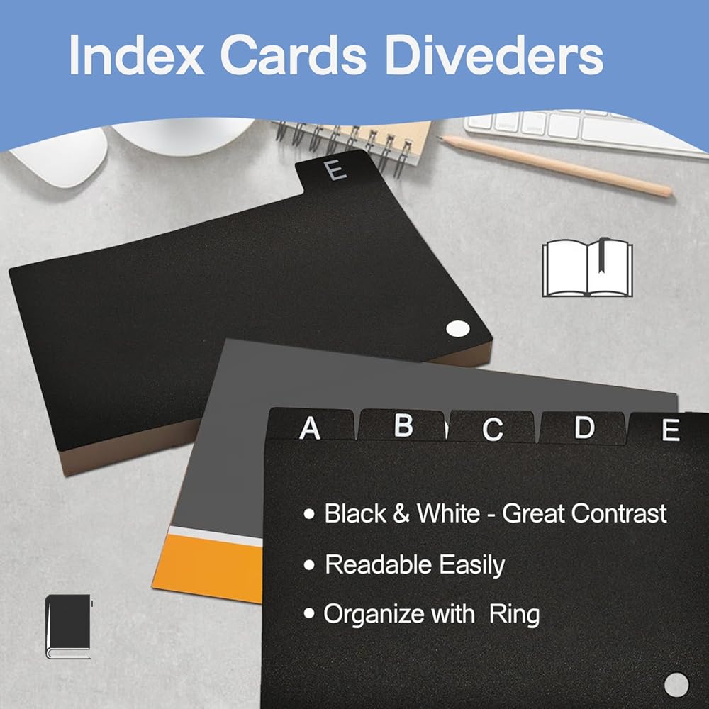 Index Cards Dividers 3x5" with Ring, Large Plastic Index Card Divider Alphabetical Tabs, Black Photo Dividers for Index Recipe Card Box Organizer Holder, Flash Studying Card College School (Blk)