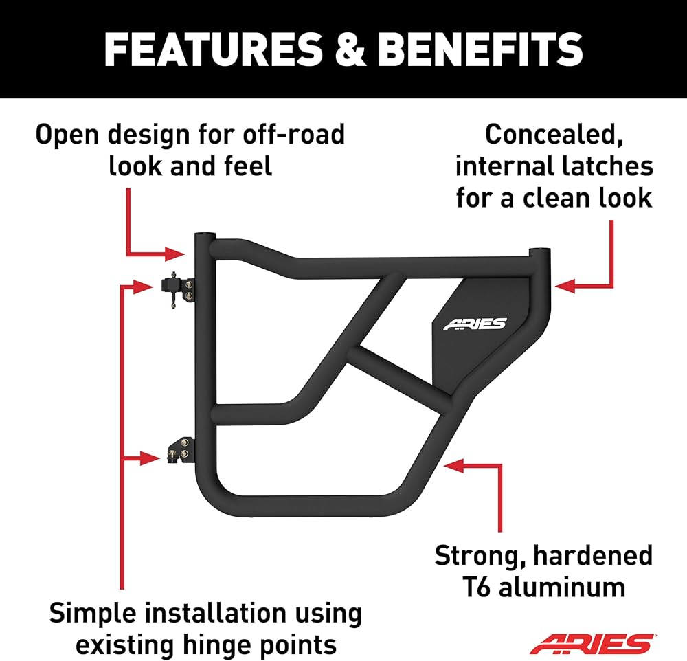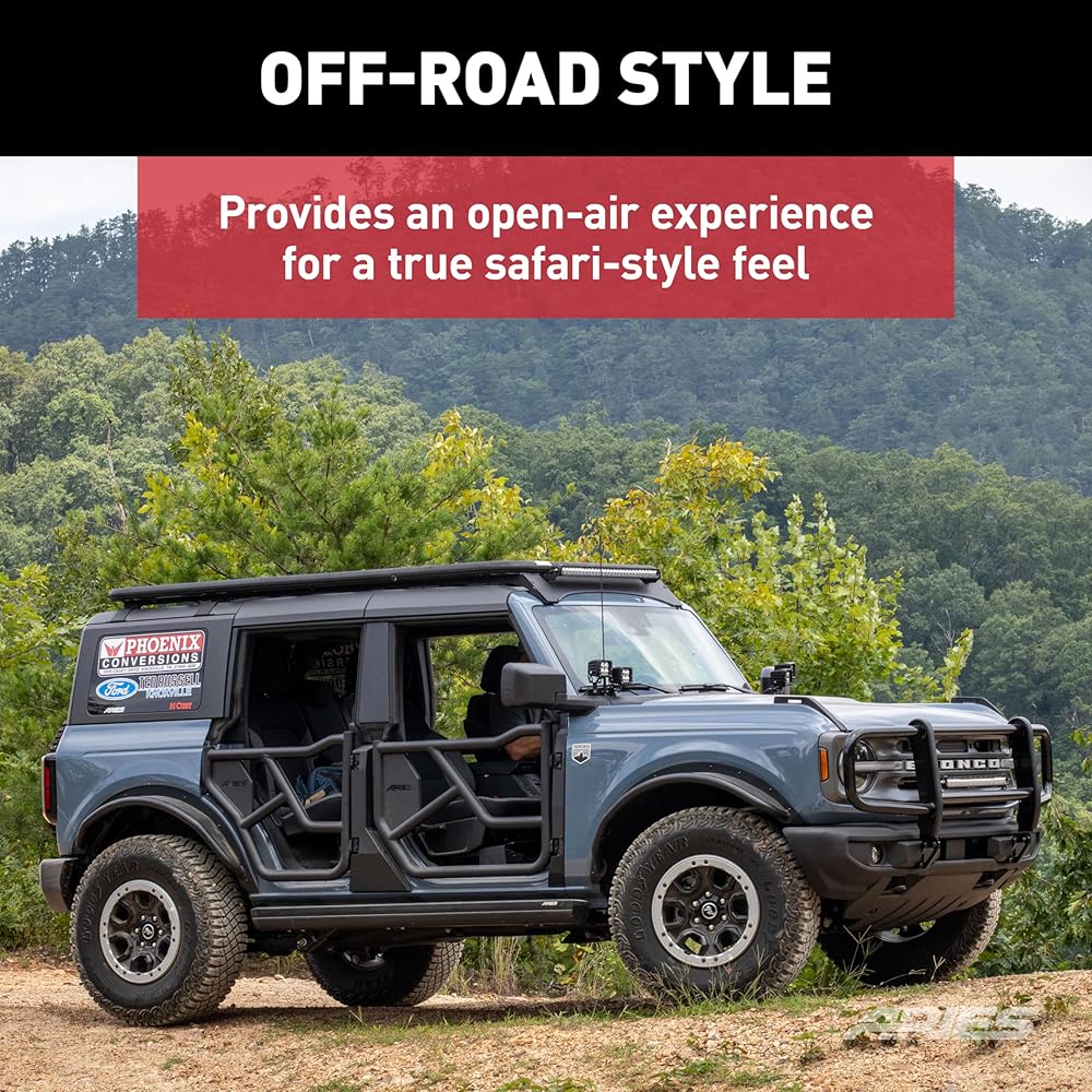 OFF-ROAD SYLE - ARIES tube style doors feature a robust and rugged look that will make your Bronco stand out. Featuring a black carbide powder coat finish and minimalistic tubular design, these tube doors add a fun off-road style and feel to your Bronco