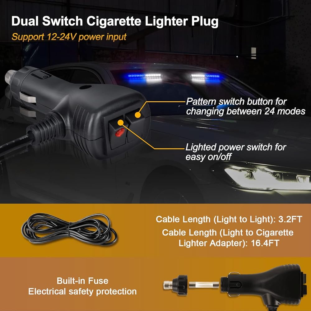 【SUPER BRIGHT】2 in 1 windshield dash strobe light bar is designed with 24 high intensity LEDS, 1.5W High power LED and TIR optical lenses maximize brightness, even visible during daytime conditions. Bright enough to be seen more than 2000ft in distance.