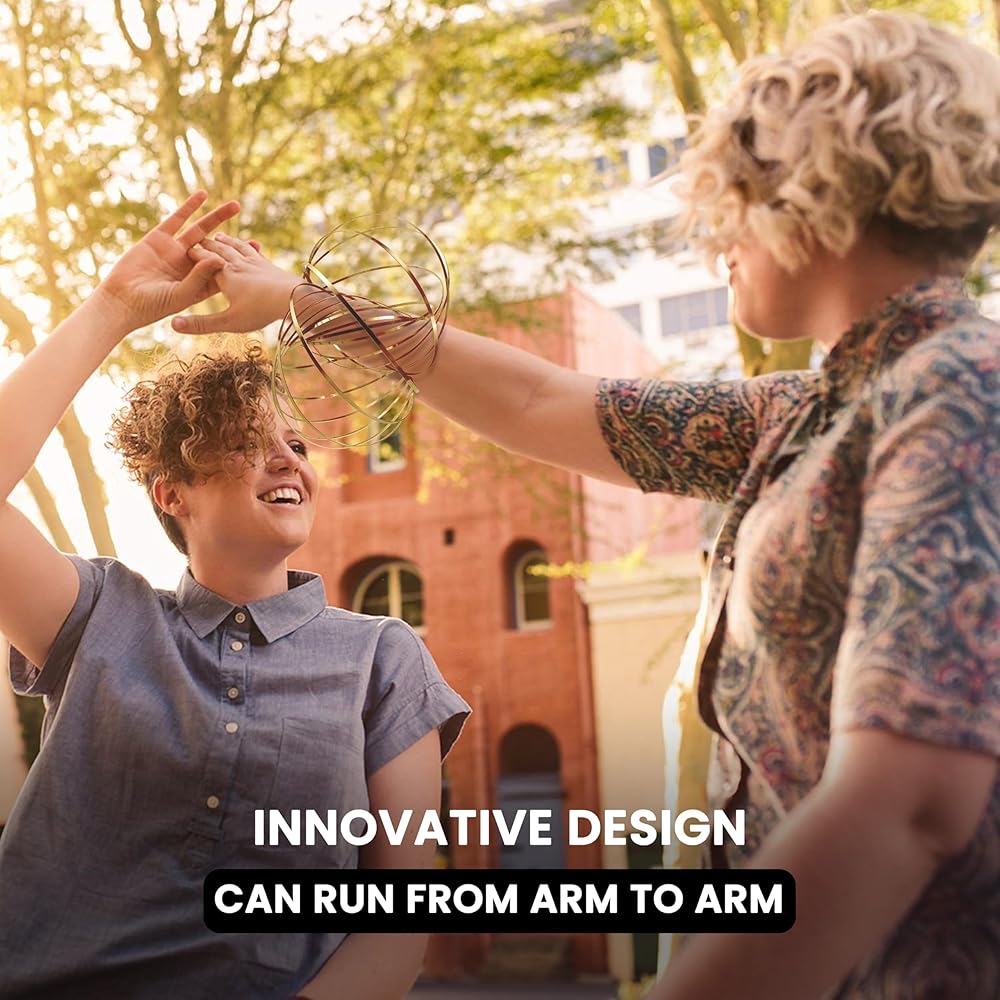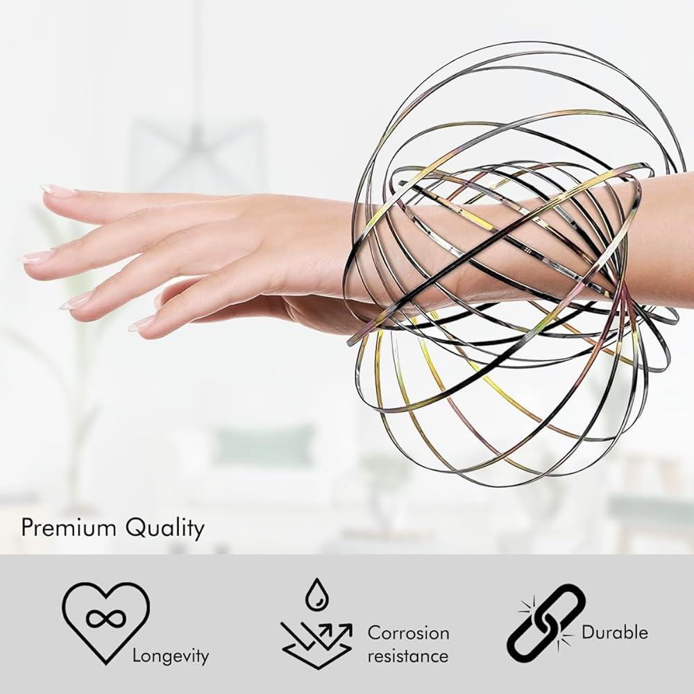 Experience the versatile and stress-relieving magic of the Mystical flow ring, often referred to as the "arm spinner" by our delighted customers. It offers multiple engaging uses, from running it along your arms, legs, or between them to becoming a captivating dance prop. Health professionals now endorse it for its anxiety and stress-relief benefits, making it a valuable tool for relaxation. Fun and easy to use, simply spin the ring clockwise, flatten it, and slide it over your arm. Ideal for standing out at concerts or shows, it's a favorite among kids who are mesmerized by its motion. This 3D kinetic flow ring is built to last, made from high-quality stainless steel that smoothly transforms without breaking. Compact and portable, it expands from approximately 5.12 inches to 8 inches in diameter, making it easy to carry. Its unique rainbow effect adds an element of fun, and it's a perfect gift for both kids and adults, offering hours of entertainment while reducing anxiety and stress.
