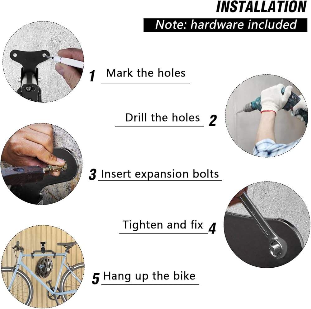 [WHAT YOU GET]: Bike Hook for Garage X 2; Hardware Set X 1; Bike Wheel Strap X 2. Note 1: Not suitable for bikes whose handlebars more than 32 inches; Note 2: Only allowed to install on solid stud / beam / brick / masonry / concrete wall / solid wood. Plasterboard / dry wall surfaces are not allowed to be installed.