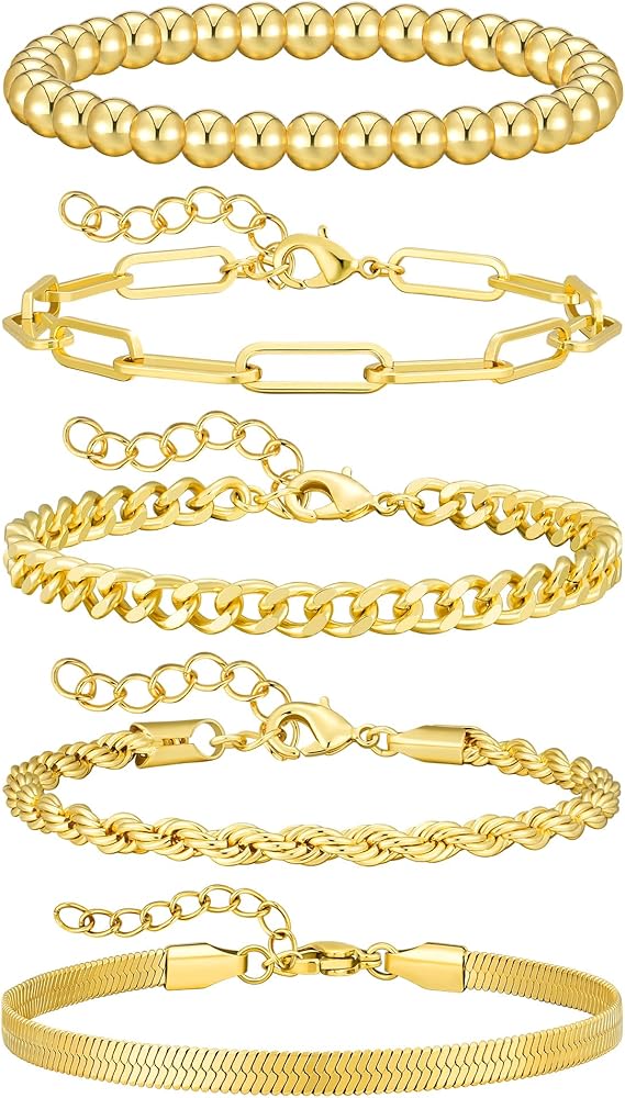 Gold Beaded Bracelets: 5 stackable beaded bracelets set with strong elastic string and 3 kinds of gold beads (diameter: 3mm/ 4mm/ 5mm). 18k real gold plated bracelets, lead and nickel-free, hypoallergenic, and non-tarnish, The stretchy elastic design ensures a comfortable fit for wrist size, and is easy to wear all day long.