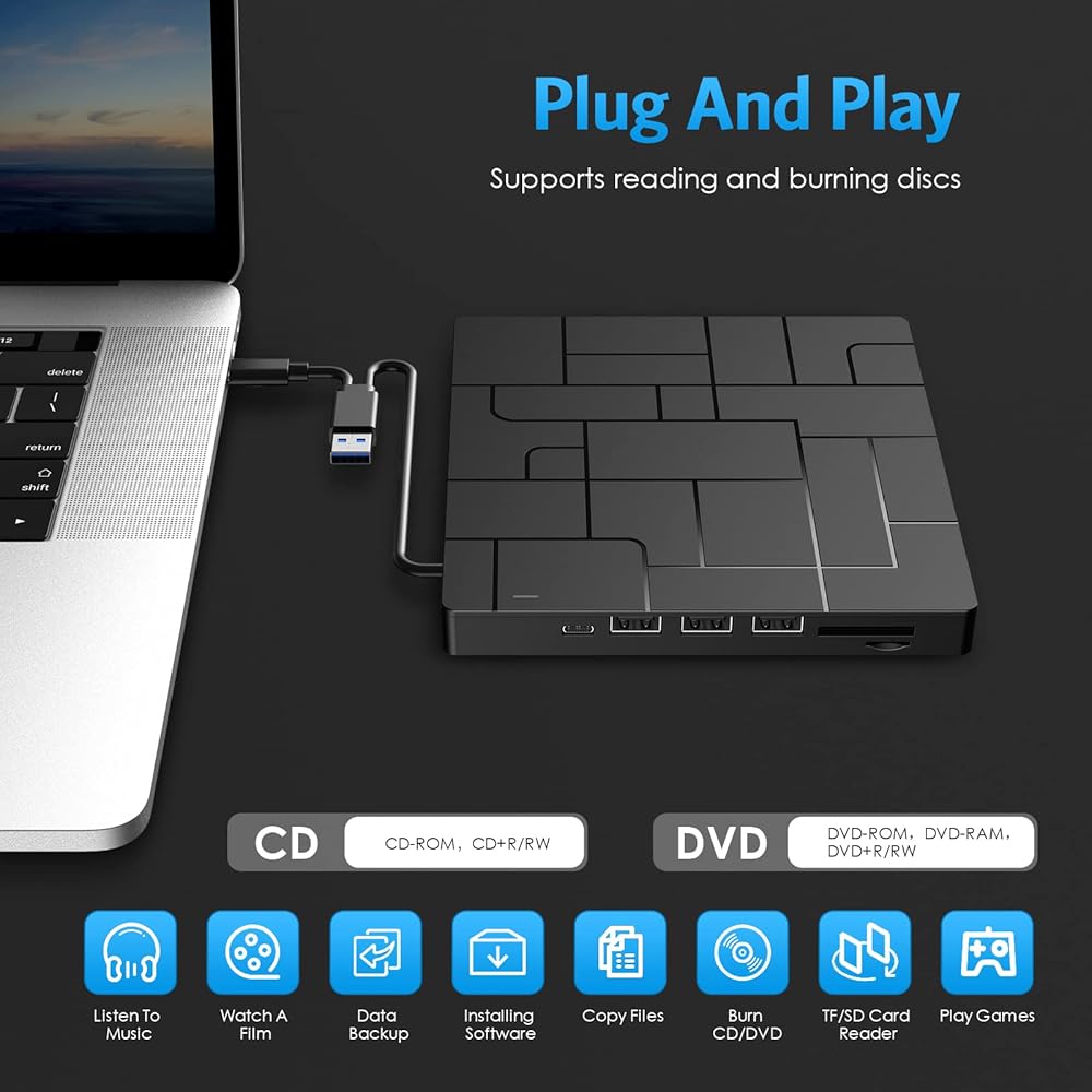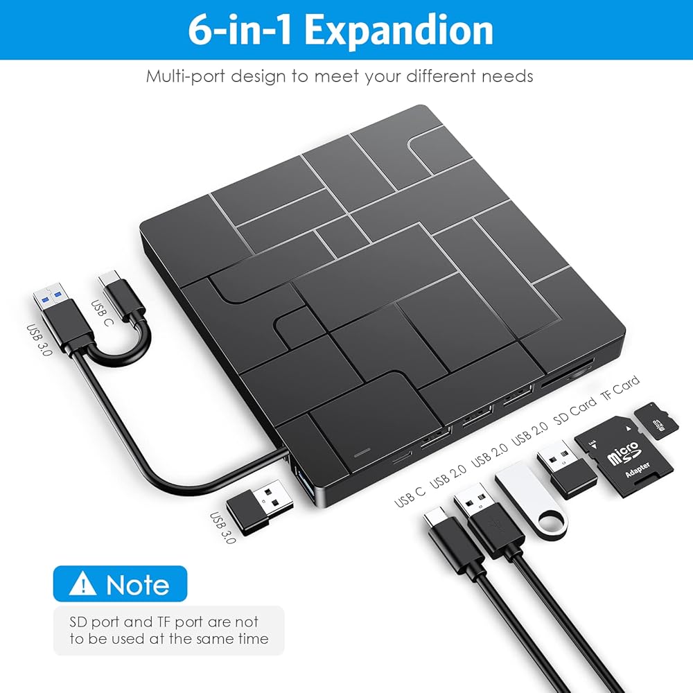 💽【6-in-1 Integrated Design】- The external DVD drive can not only be used to read or burn discs, but can also be used as a USB hub, including one USB 3.0 port, three USB 2.0 ports, one TF slot, one SD card slot and one Type-C port. the USB port can be connected to a hard drive, mouse, computer cooler, etc. The card slot is perfect for transferring photos and video files taken by the camera from the TF card/SD card to your computer; the Type-C port can be connected to a power supply to power your optical drive to ensure more stable operation.