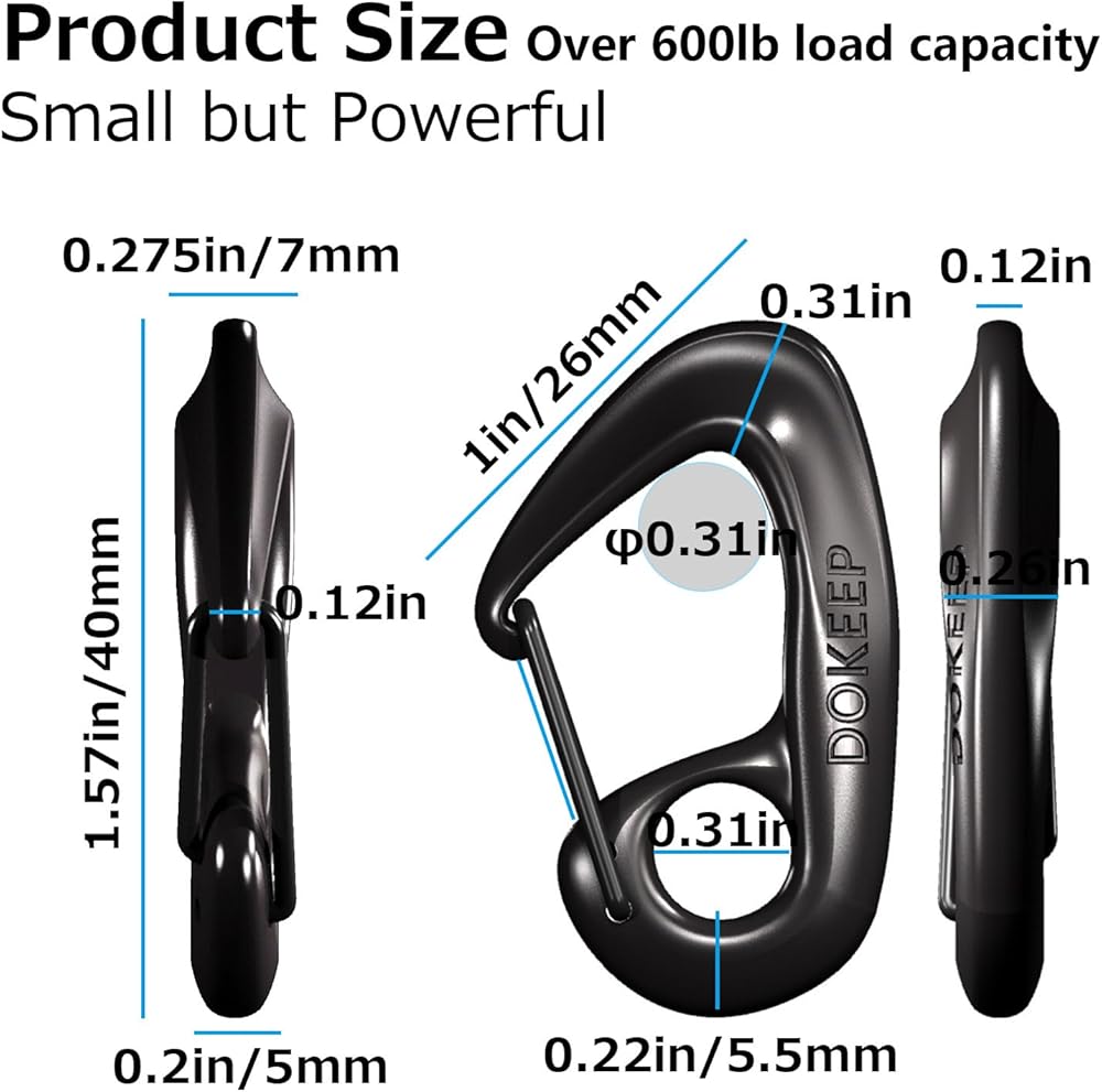 【Product Specification】:Mini zinc alloy snap hook, load capacity 600lbs/300kg, length 1.57 in, width 0.93 in, thickness 0.39 in, weight 0.44oz/12.5g, tensile strength σb (MPa)≥740.
