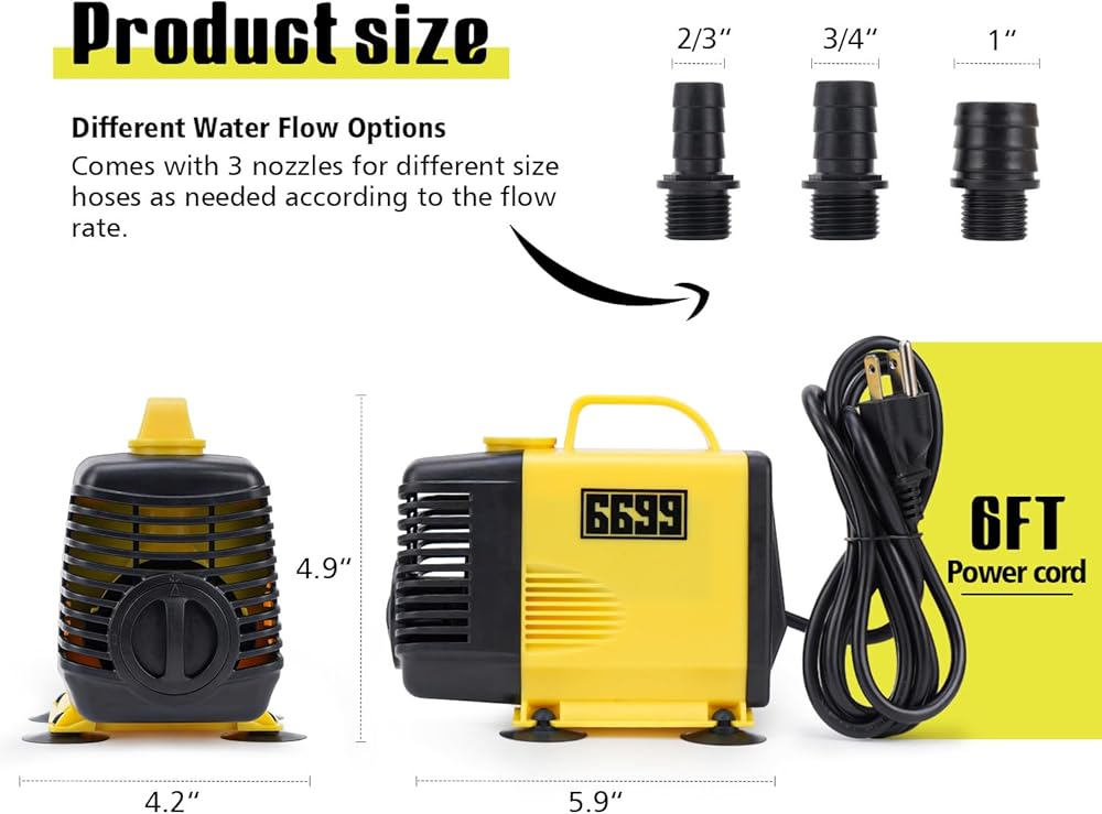 【Small yet Powerful】Pump Size: 5.9 x 4.2 x 4.9 inches. This fountain water pump with 6ft power cord, the max flow rate can be up to 800GPH and the max delivery height can be up to 10FT.