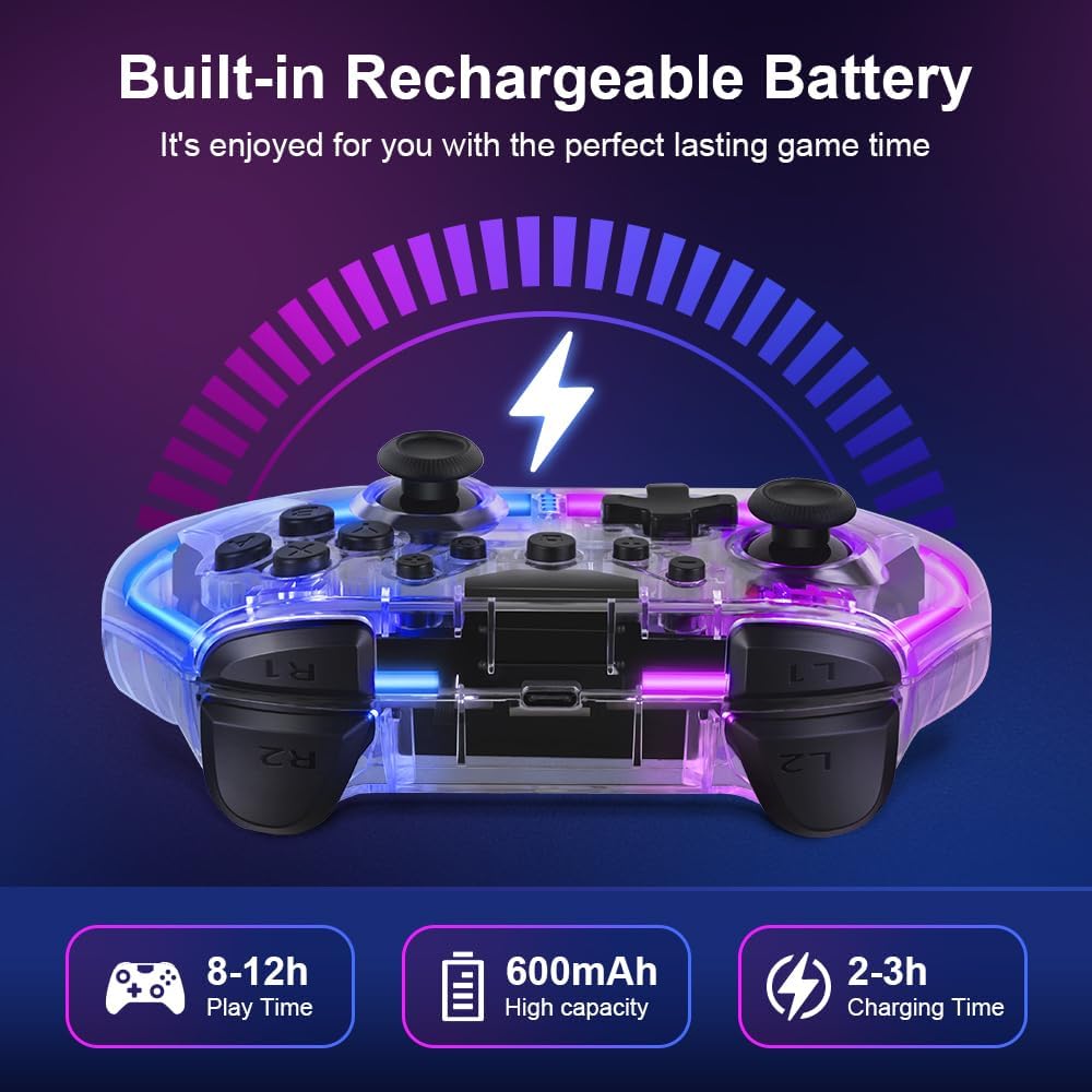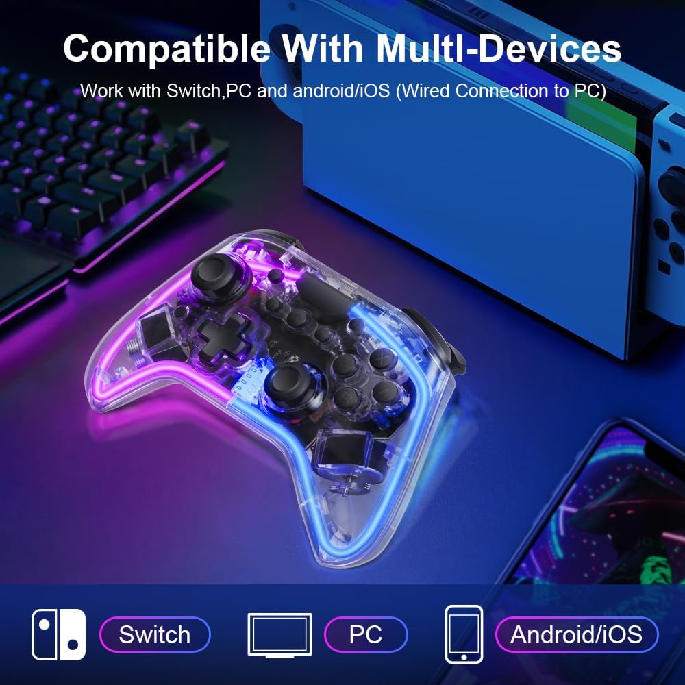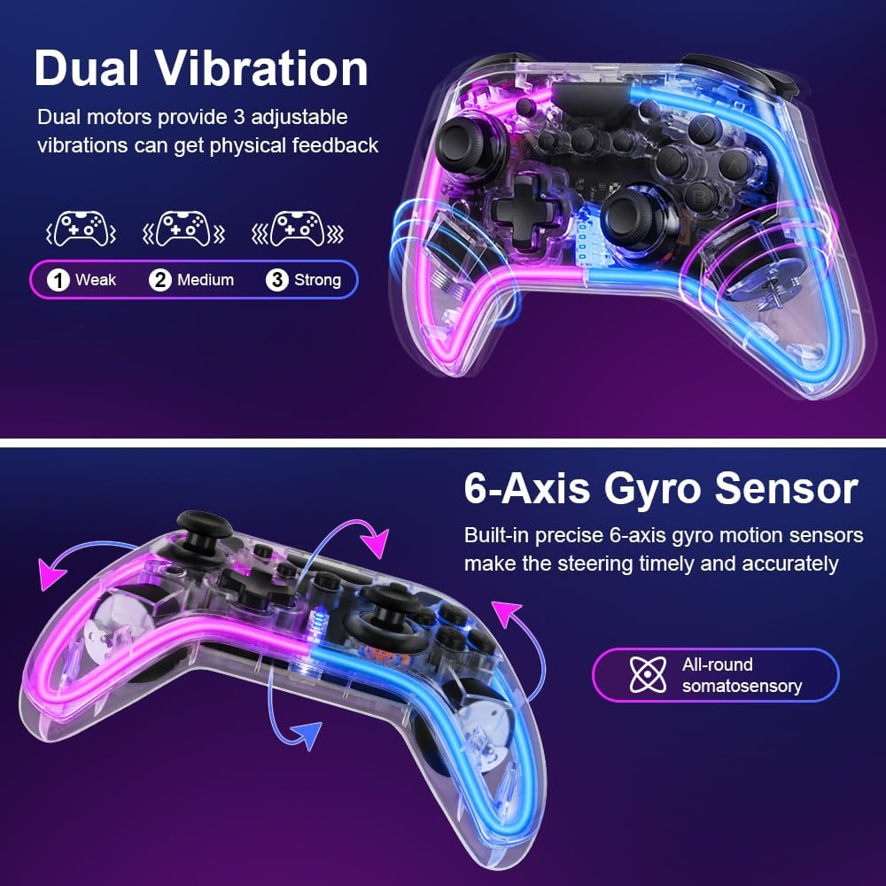 【Multiple COLORS LED LIGHT & 3 MODES】The Switch controllers made of tough PC transparent material, with an embedded RGB strip that combines 10 colors to create a captivating gaming lighting atmosphere. It offers 3 different light modes, which can be easily controlled using an additional button. Customize the lighting effects according to different games and immerse yourself deeply in the game world.