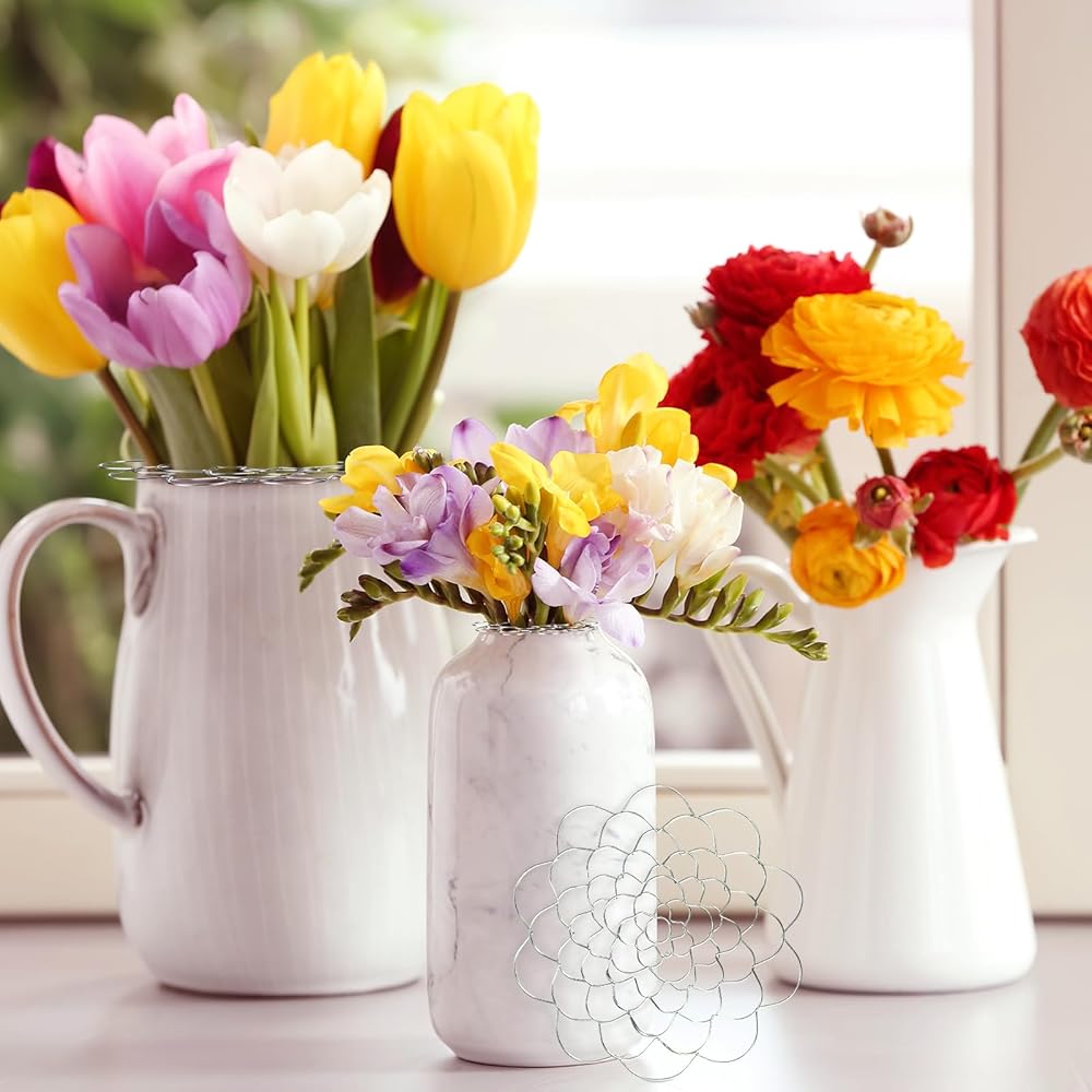 Size description: This metal flower arrangement cover has diameters of 4 inches/10.16cm, 5 inches/12.7cm, 6 inches/15.24cm, and 7 inches/17.78cm. It is easy to use and suitable for most ordinary vases.