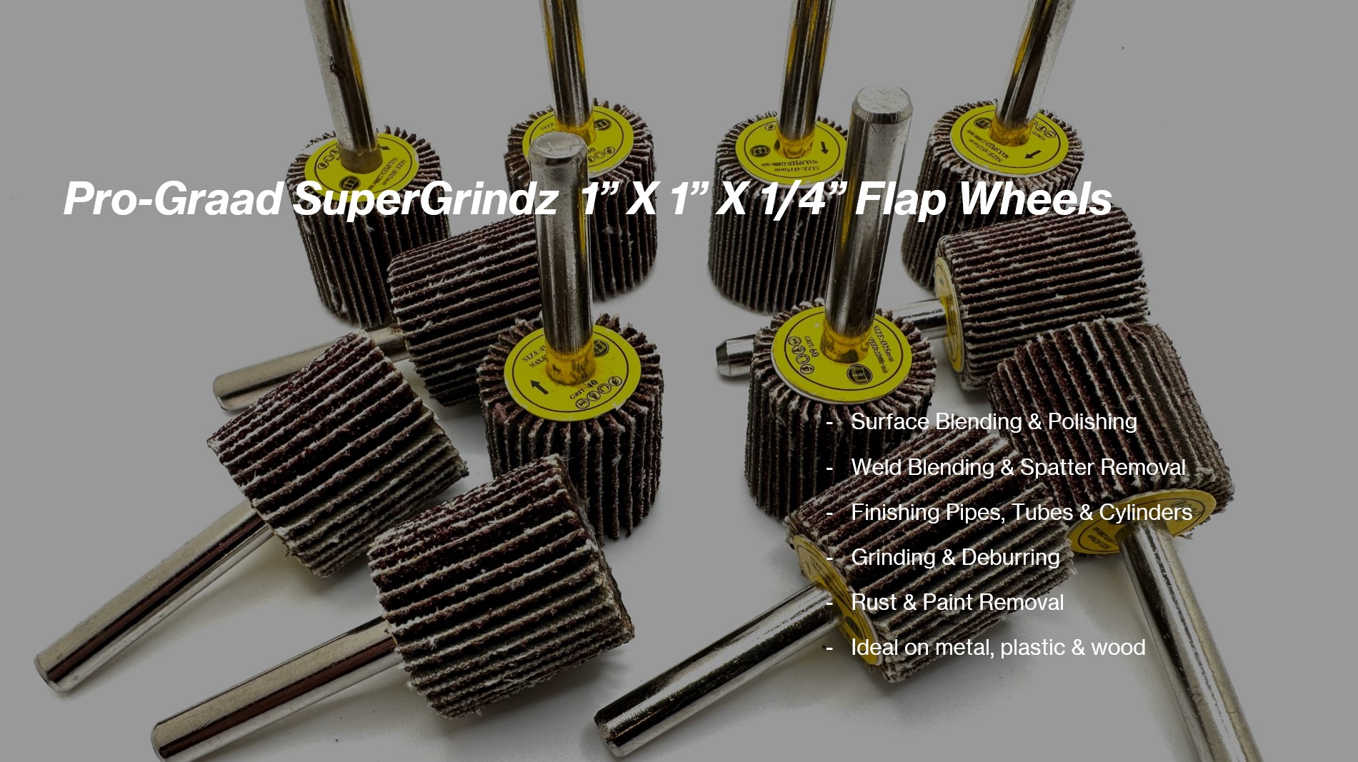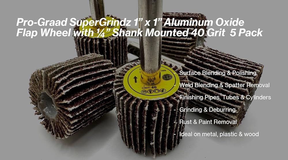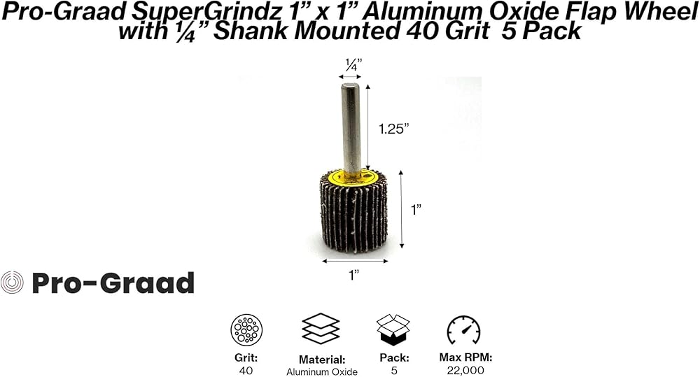 What's Included: 5 pieces 1" x 1" x 1/4" 40 Grit TwistFlex Aluminum Oxide Shank Mounted Abrasive Flap Wheels