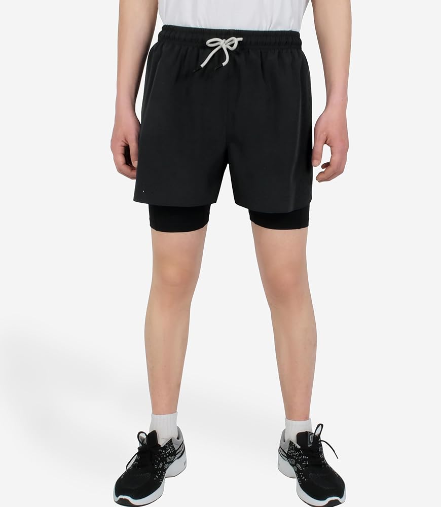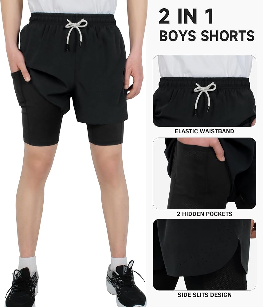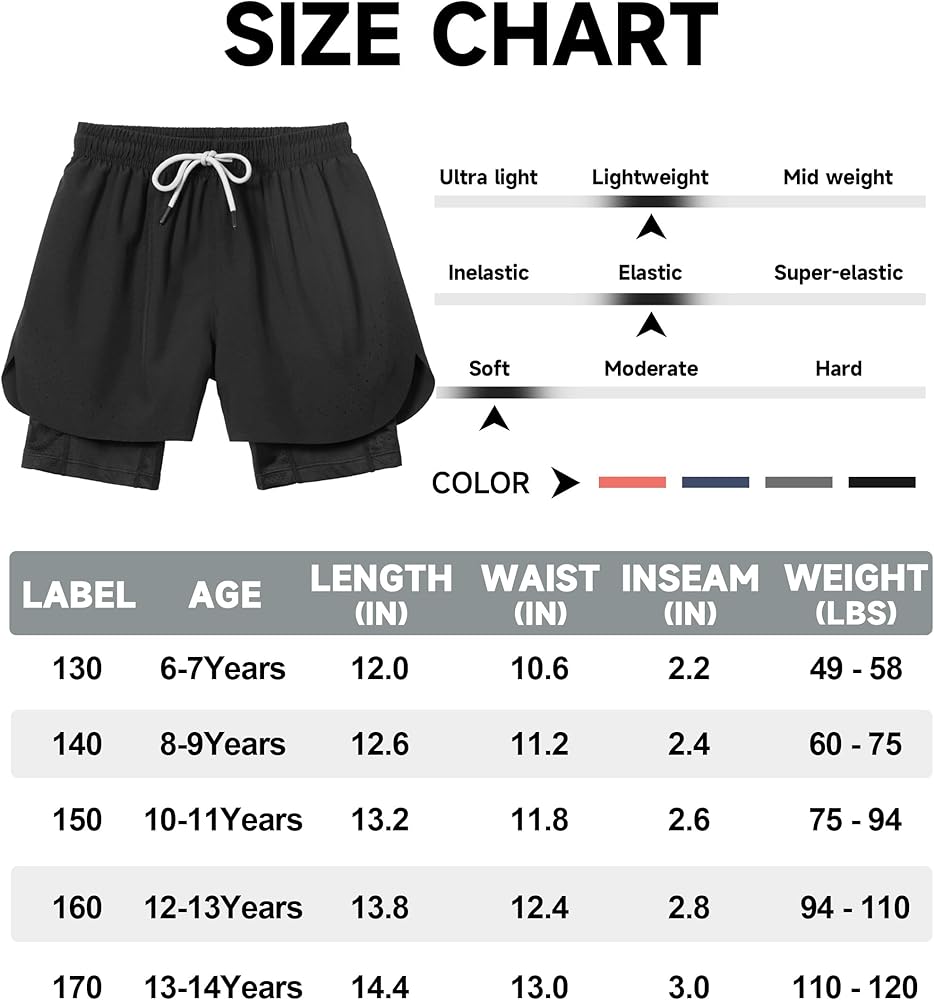 2 In 1 Design - Kid shorts are double-layer design, the outer layer is lightweight, loose fit and quick-drying; the inner lining is soft, slim fit and breathable, keeping you cool and chafing-free during workouts.