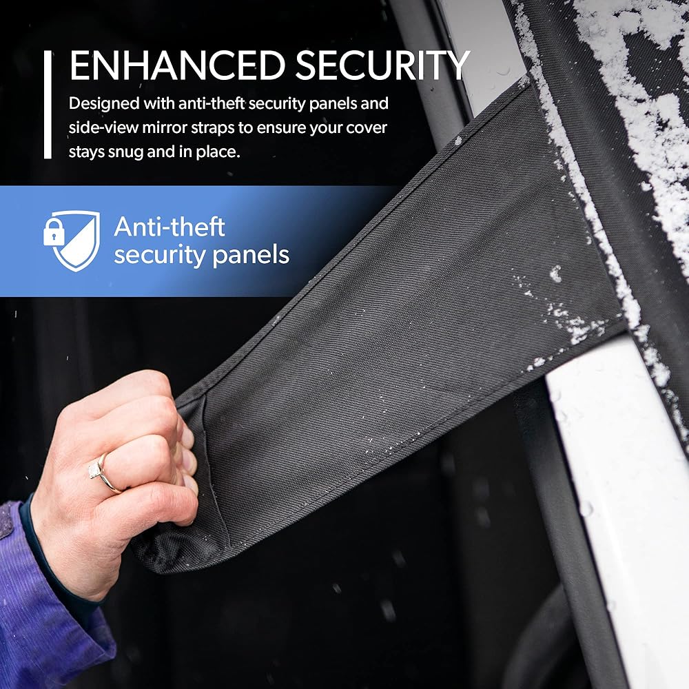 Anti-Theft Design | Features side mirror straps for a snug fit, and 2 security panels. Simply shut the security flaps in the car door to prevent theft. The cover is made from durable polyester backed with a weather-resistant PVC lining to make it stick-resistant.