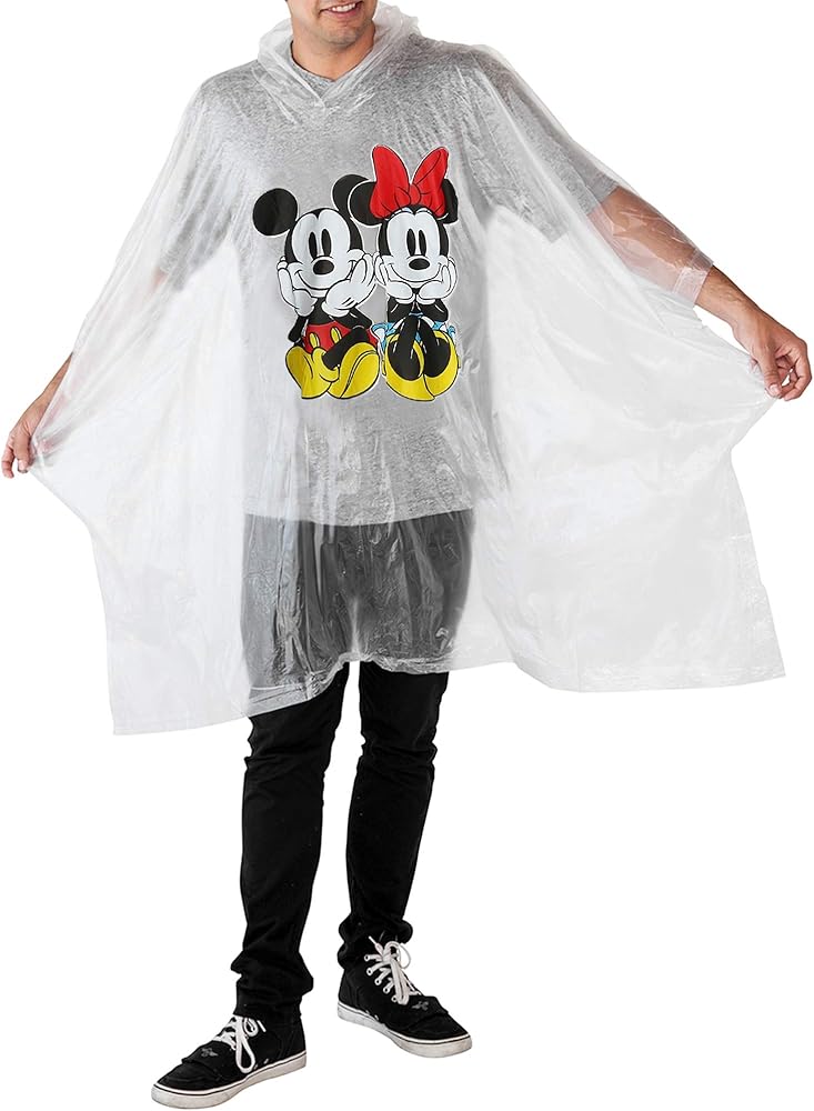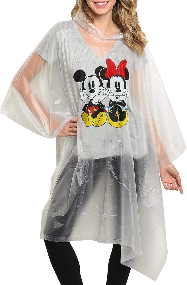 Show off your Disney style - Mickey Mouse & Minnie Rain Poncho - officially licensed. Adult size; Unisex style - for men and women. Side snap buttons and attached hood. For a rainy day or to keep from getting drenched on Water Rides like Splash Mountain.