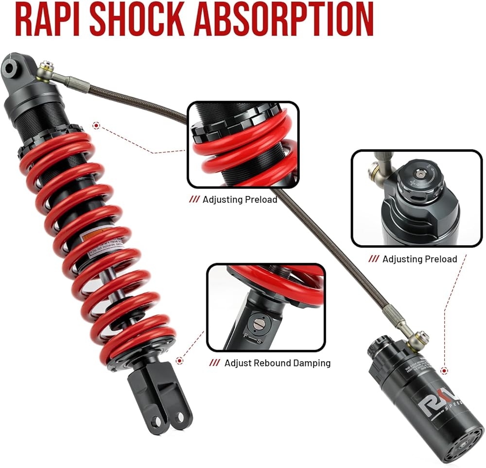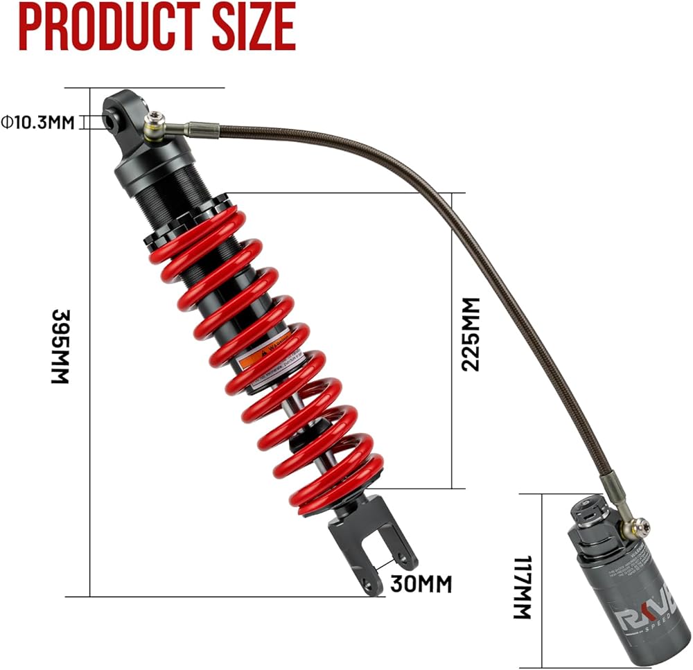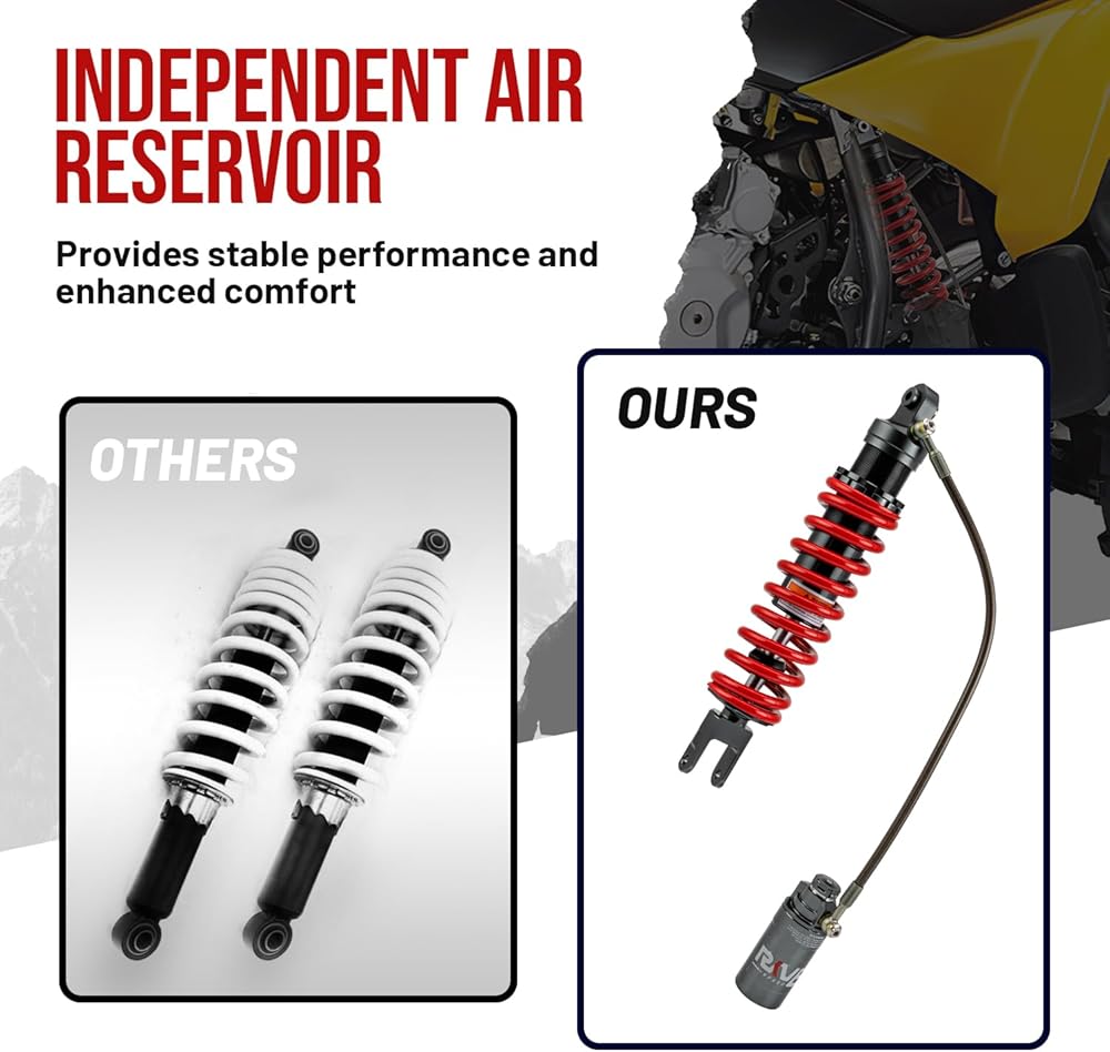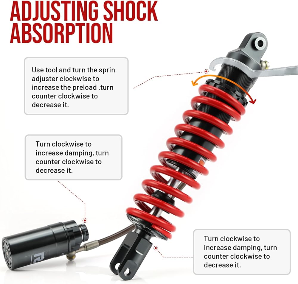 【Adjustable Preload】Our air shock absorber features spring preload adjustment, enabling precise tuning to enhance shock absorption. Additionally, our unique hydraulic construction system effectively reduces bumps and vibrations on the road surface, prolonging the life of vehicle components. This system ensures stable performance and provides enhanced comfort during your ride.