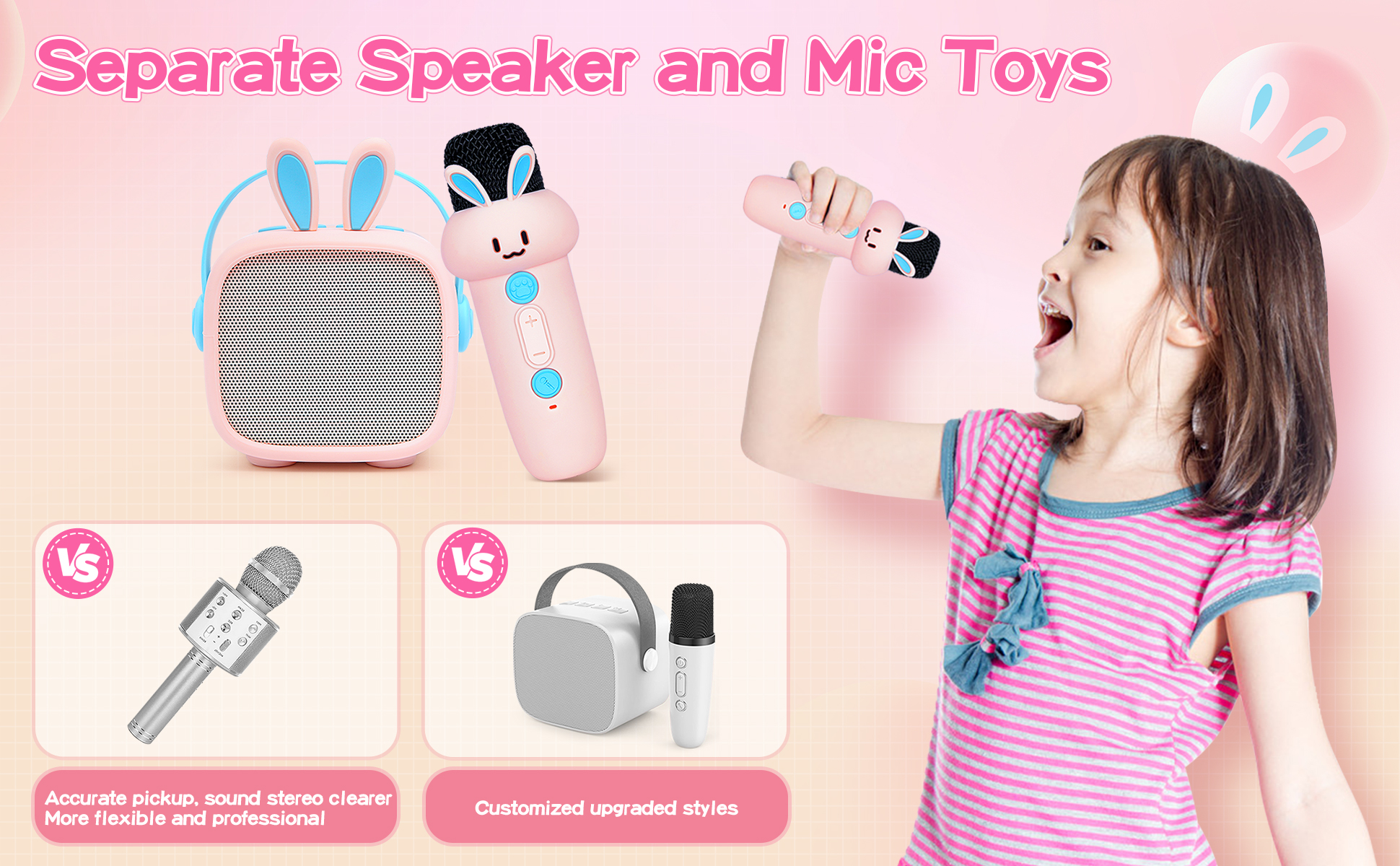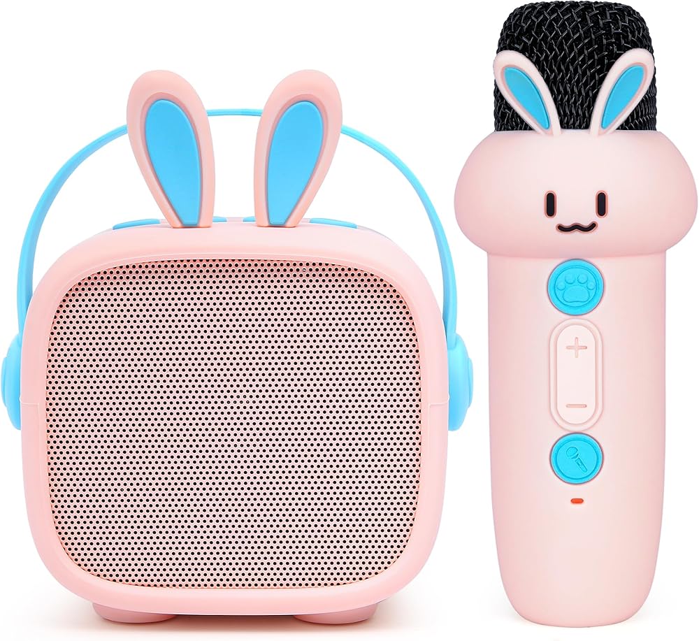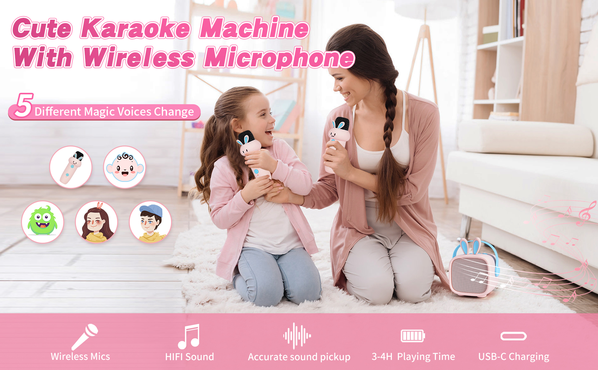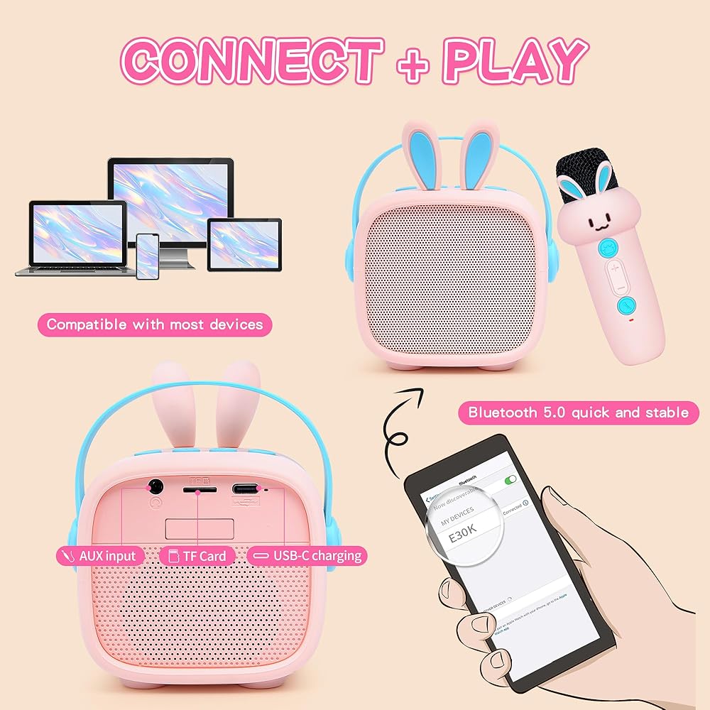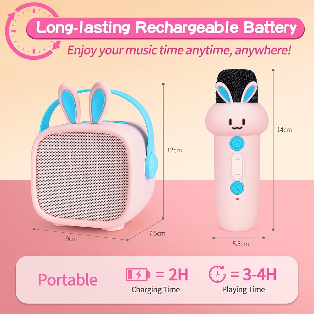 Powerful Karaoke Machine for kids. It comes with 1 cute wireless speaker, 1 rabbit mic, 1 type-c charging cable and a user manual. This is exactly what every child who loves to sing and host needs!