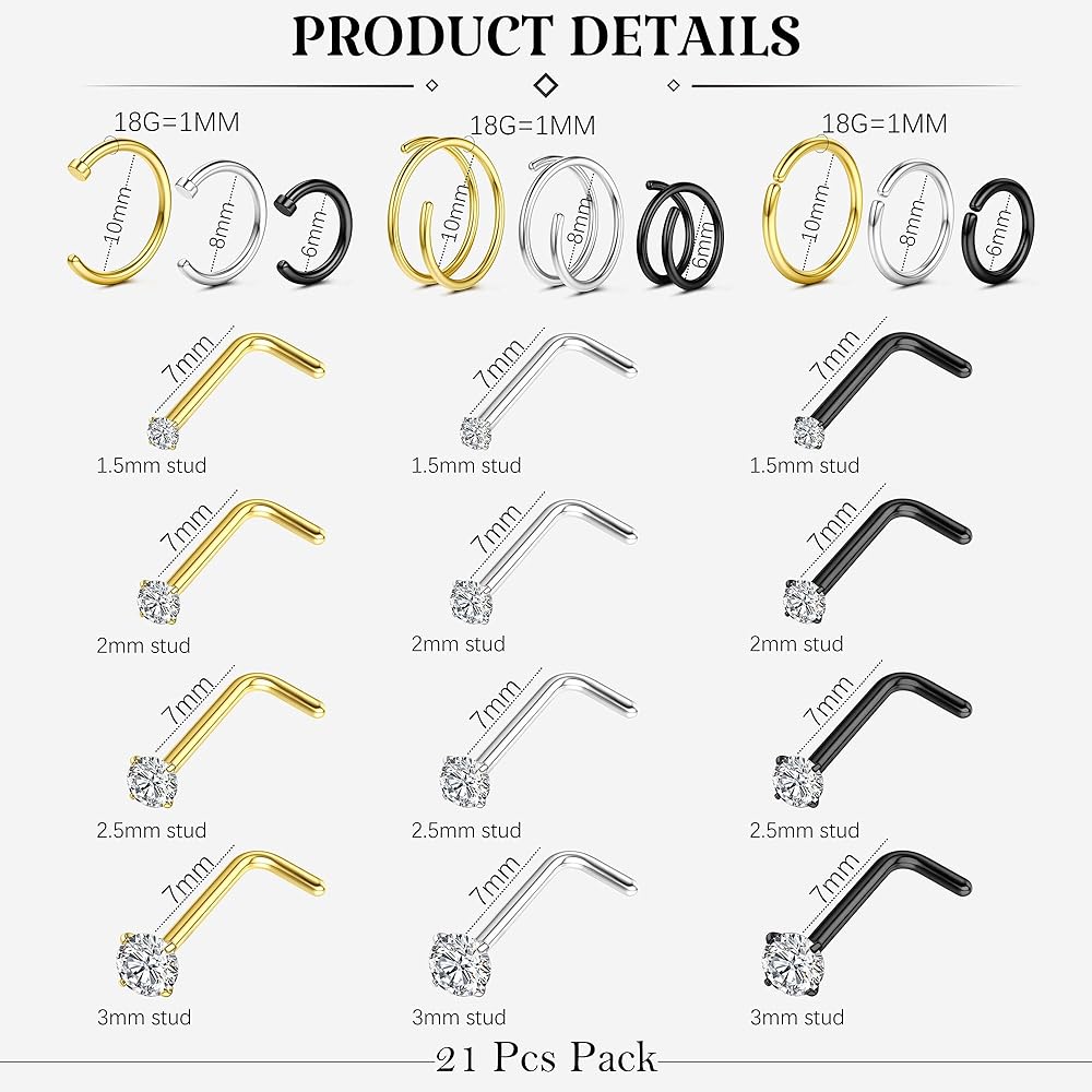 💎【GAUGE SIZE】Small nose jewelry gauge size: 18G=(1mm). Hoop nose ring inner diameter: 8mm, L shaped nose studs post length: 7mm, cz stud size: 1.5mm, 2mm, 2.5mm, 3mm. All nose rings studs is easy to put on and take off, suitable for women and men.