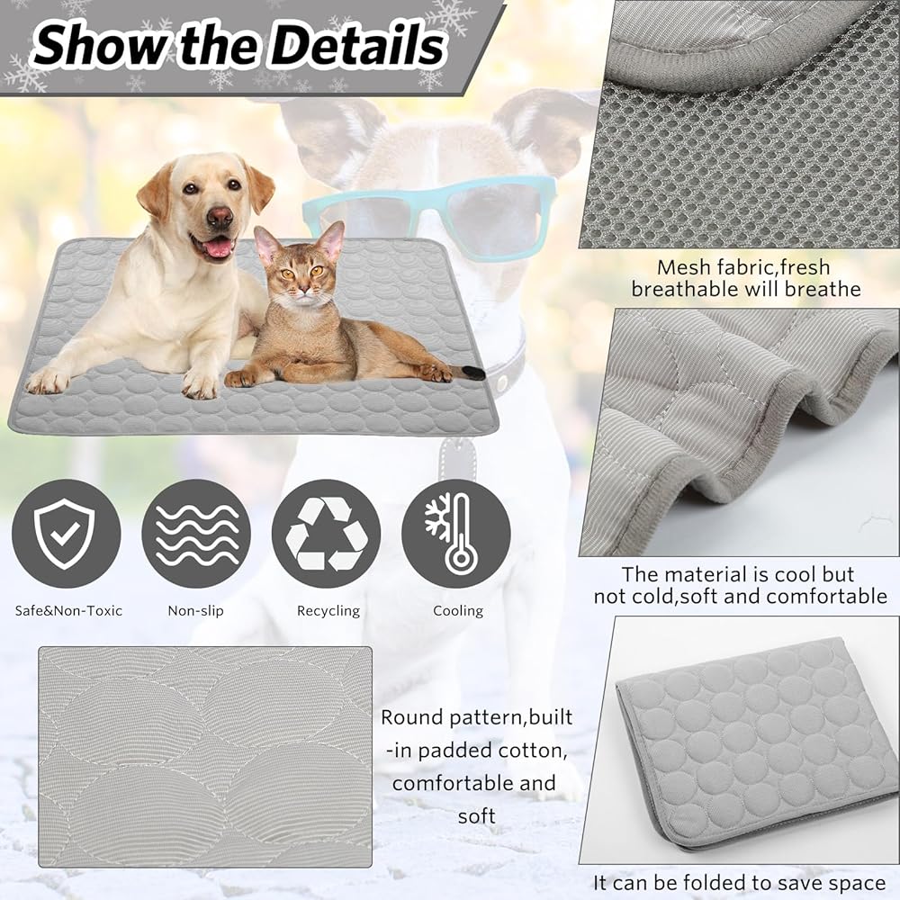 Upgraded Pet Cooling Bed Mats: The dog cooling mat is made of high quality self cooling ice silk surface, filled with soft cotton and breathable mesh bottom, very comfortable.