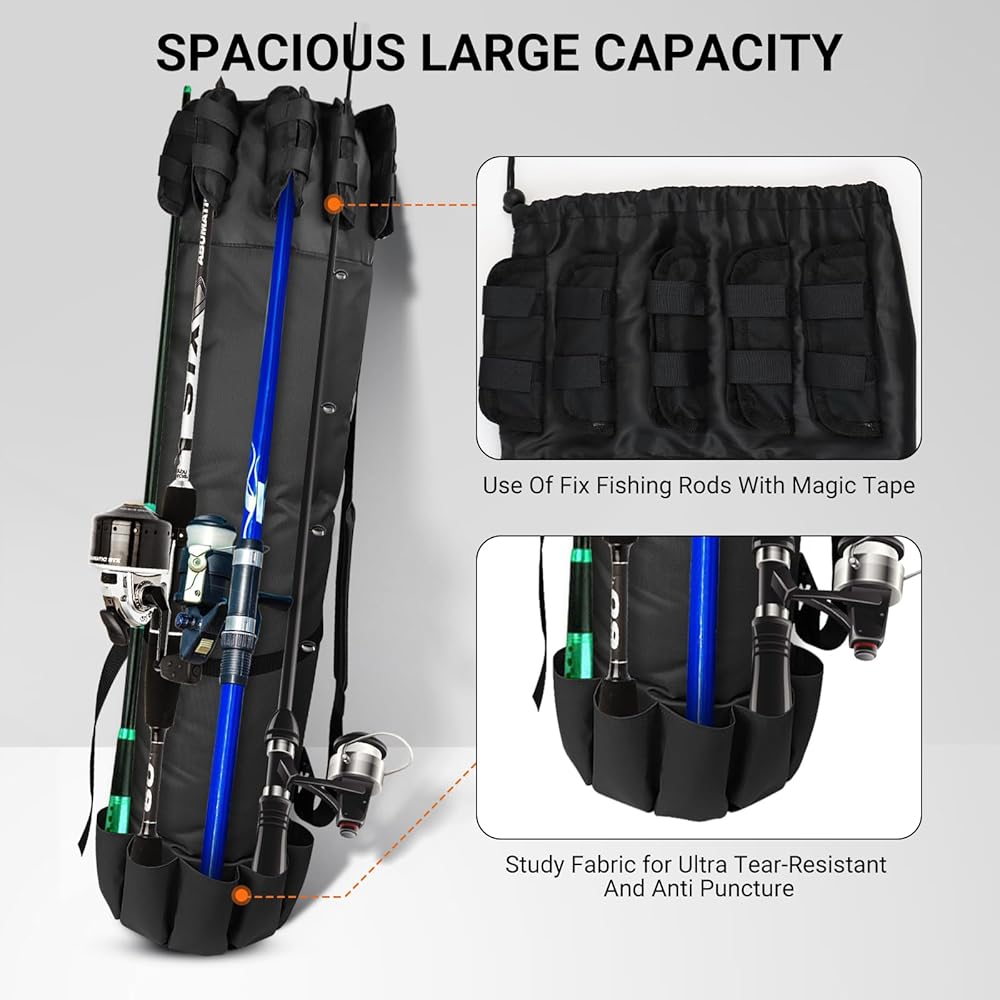 Can accommodates 5 rods and reels on the outside and fix it with magic tape, make you never worry about dropping them.