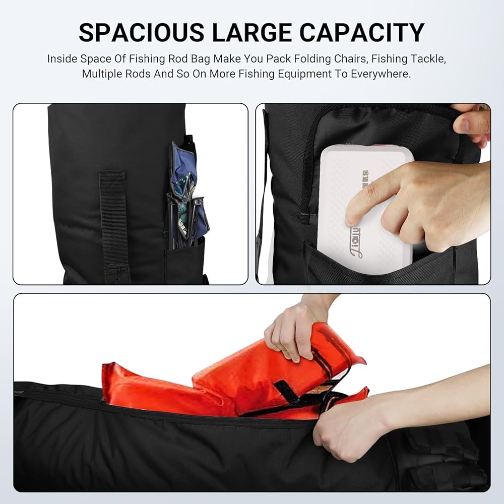 Extra large capacity can make you pack folding chairs, fishing tackle, multiple rods and so on more fishing equipment to everywhere.