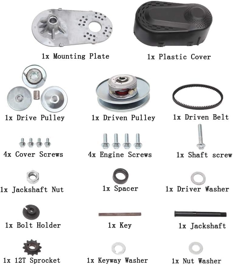 This is a complete kit that includes both drive and driven clutch pulleys, belt, aluminum engine mount plate, built in jackshaft with sprocket, all mounting hardware.