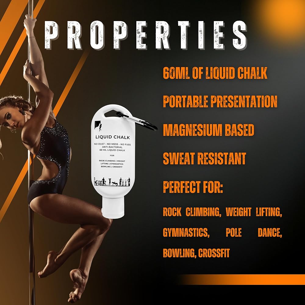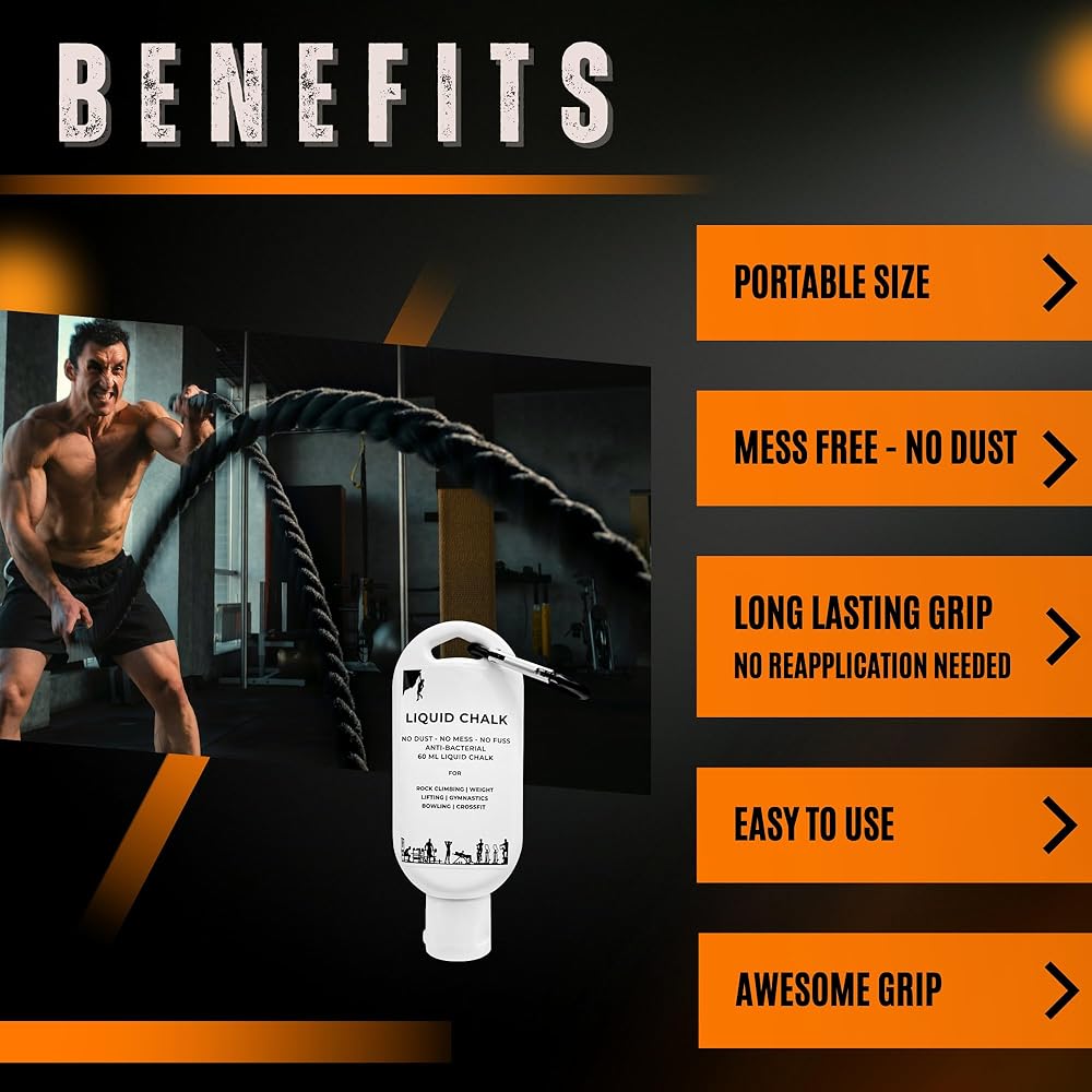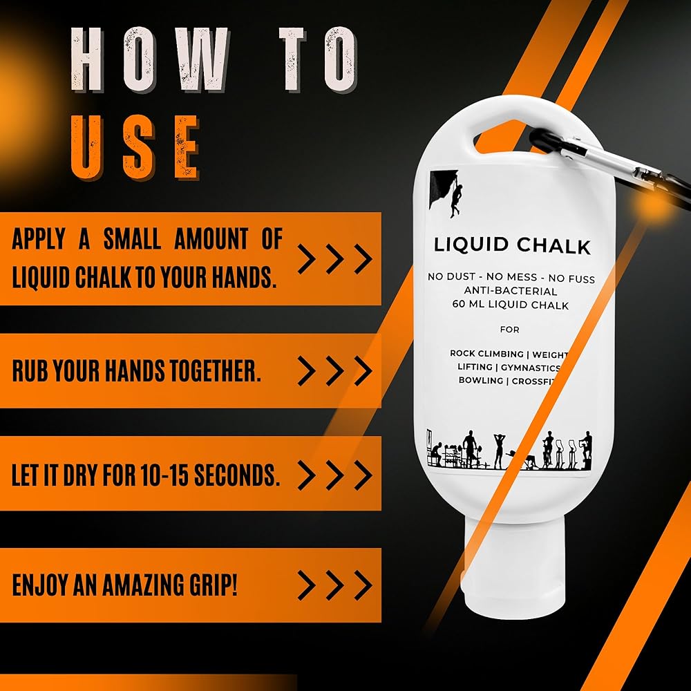 • Mess-Free Application: Say goodbye to the mess and hassle of traditional chalk! convenient Liquid Chalk allows for precise application without any residue or chalk dust. Simply squeeze in your hand and apply a small amount to your palms, rub them together, and experience the effortless glide that. Liquid Chalk offers a mess-free alternative, providing superior grip and performance for athletes in various fields, from powerlifting to climbing and gymnastics.
