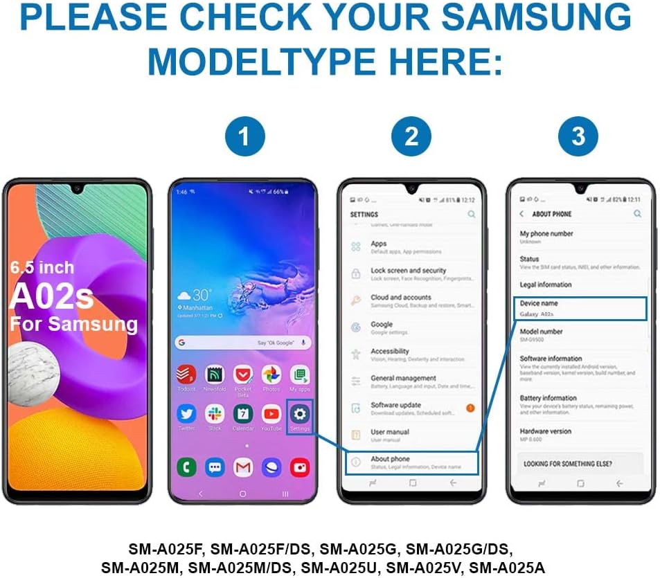 Compatible with Samsung Galaxy A02s SM-A025 2021 Important: Please check the Model Number of your device before purchasing this Item. You can find the Model type of your device on your device and / or in the settings.