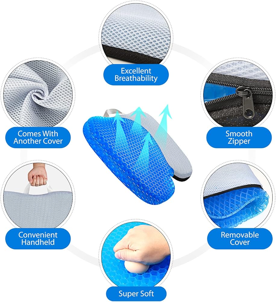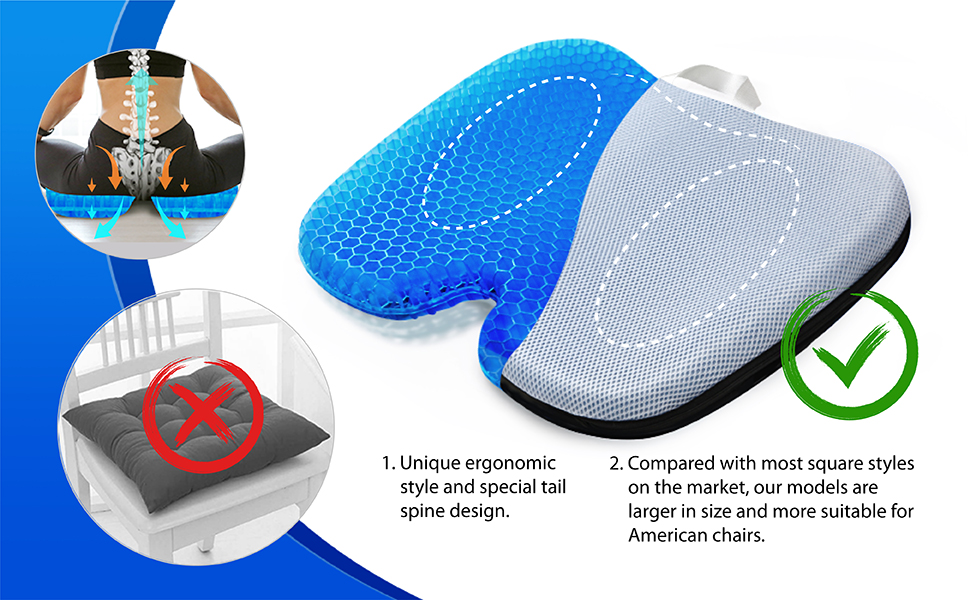 <b>ONE GEL CUSHION, 2 FEELING</ b> - It's upgraded from traditional memory foam material to high elastic TPE gel thermostatic material, with a built-in free-flowing air channel to prevent the seat from sweating and maintains comfortable heat dissipation. It restores to its original shape as soon as it is stretched and squeezed, and has superior durability than conventional cushion. New double-sided structure design (Diamond And Honeycomb) allow you to experience 2 different sitting feelings.