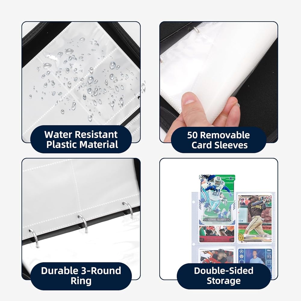 【Trading Card Holder】Open the football card holder along the zipper direction, select the card you want to collect, and gently insert it into the card slot. The flexible 3-ring design allows you easily to insert and remove the pages,the clear and transparent card slot allows you to see every detail of the cards without taking out.