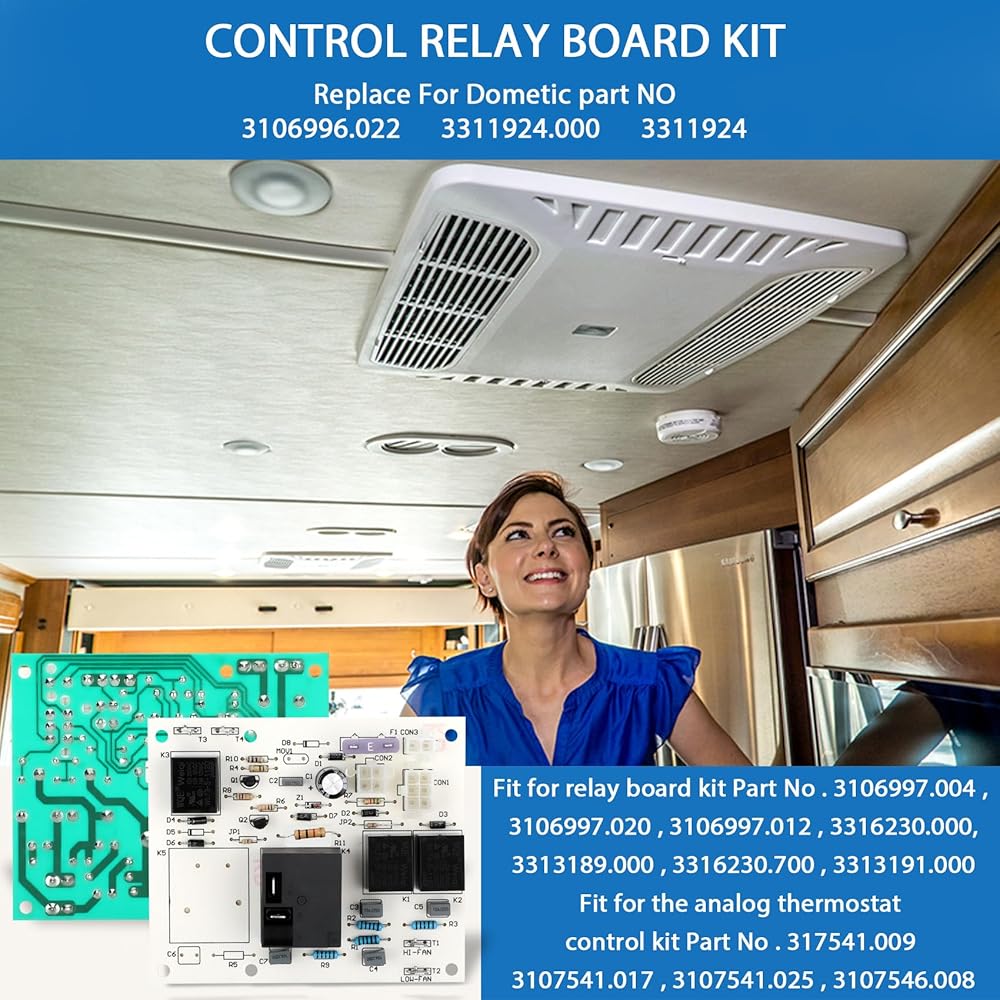【 Problem Solving 】 If you are experiencing air conditioning problems due to the relay board, such as a fan out of control, slow compressor power supply, and the compressor cannot be turned off without cutting the power supply, it may be time to upgrade your relay board! 3106996.022Heat Cool Analog control relay board for use with analog thermostat kit. The interior contains a throw-off fan system for temperature control, which helps increase the efficiency of the condenser. Function under countertop/bunk installation. Maximize the user's internal space choices. Please troubleshoot before purchasing.