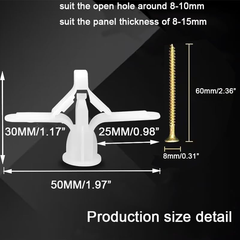 Our package contains 50 pcs screws + 50 pcs drywall anchors. The screw size is 4x60mm, and anchor size is 30x50mm.