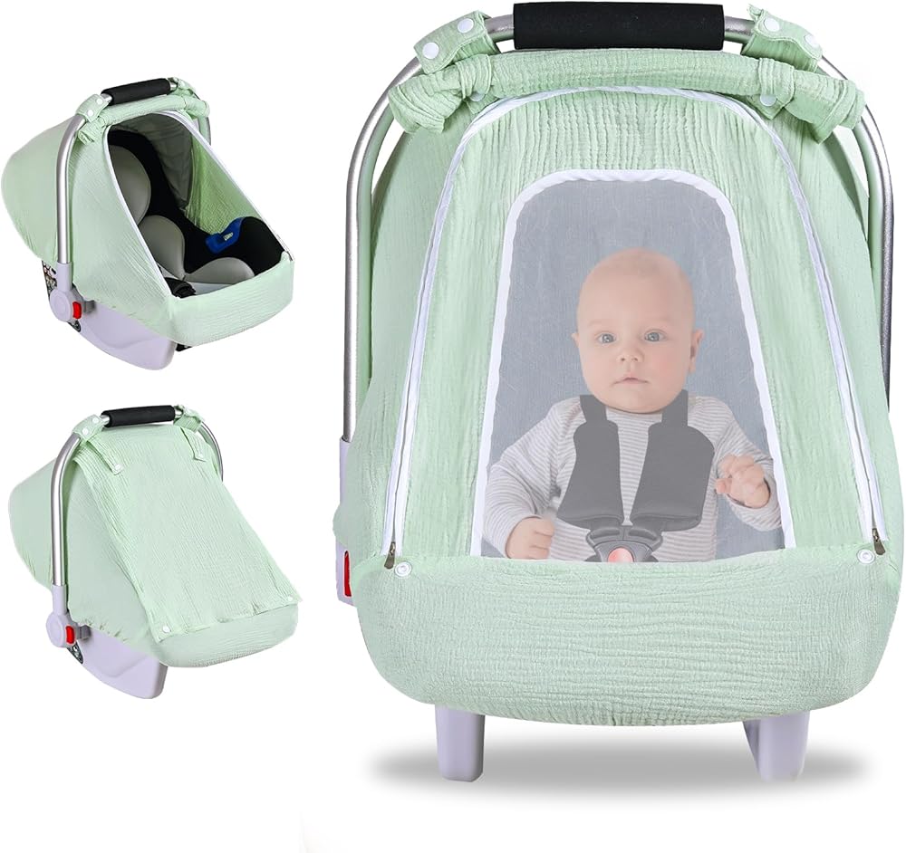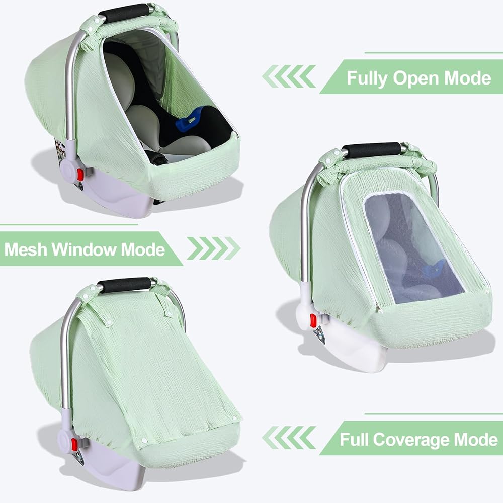 Baby Car Seat Cover for Boys Girls, Muslin Car Seat Cover for Babies with Breathable Mesh Peep Window, Lightweight Kick-Proof Infant Car Seat Canopy, Outdoor Windproof Stroller Cover (Pea Green)
