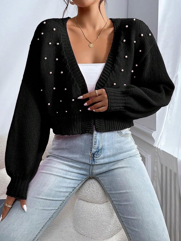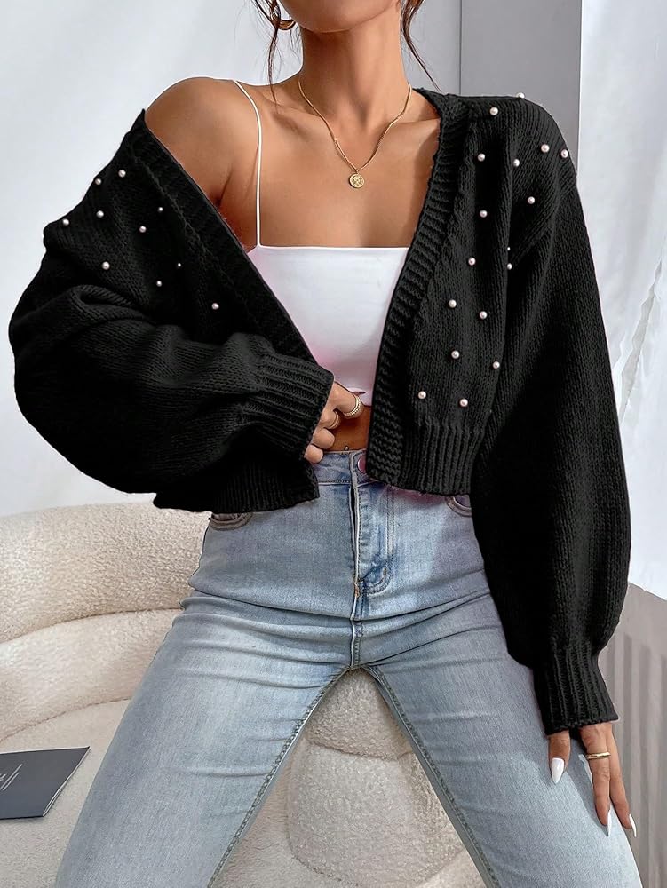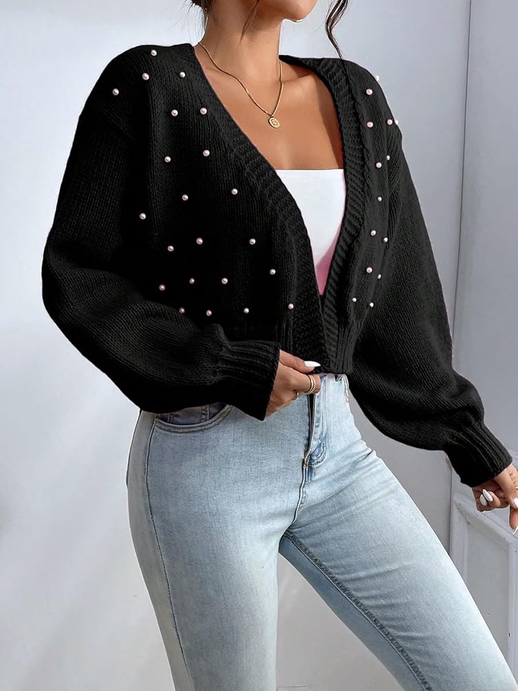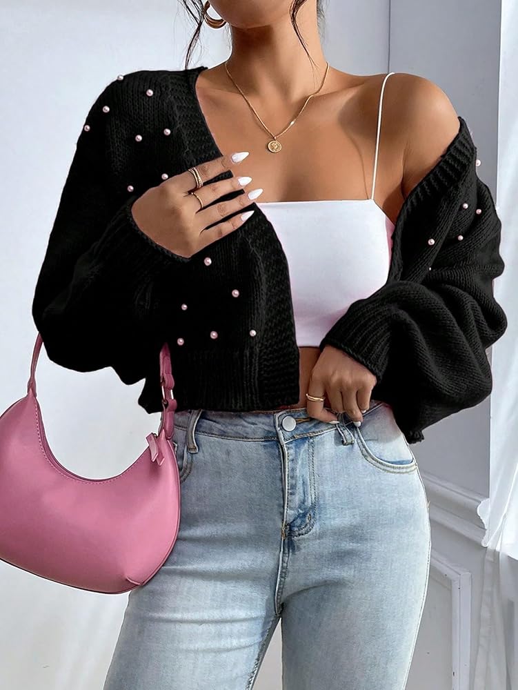 - Features: pearl beaded, open front, v neck, drop shoulder, cropped cardigan for women