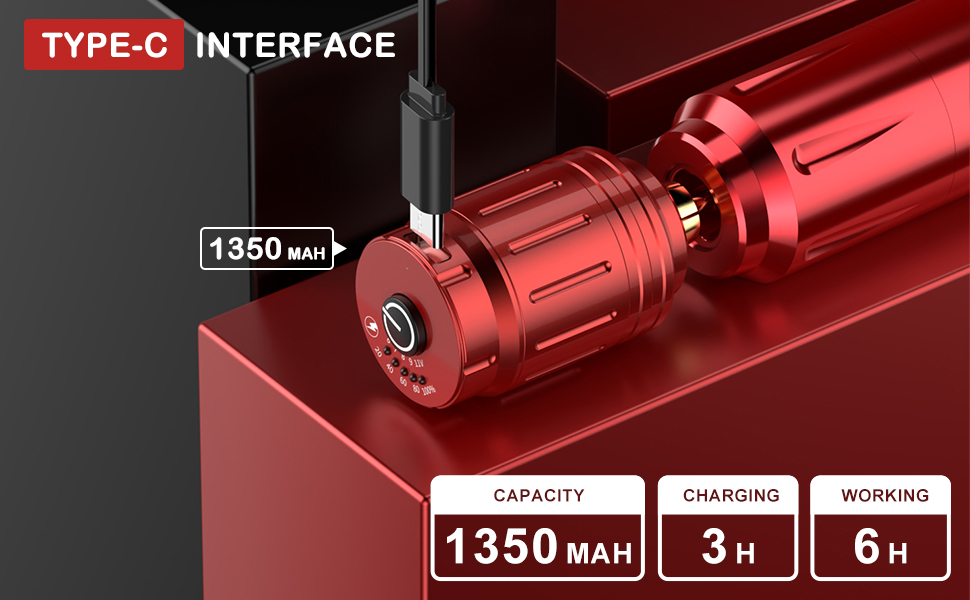 【Long battery life】 1350mAh battery pack can be charged for 3 hours and work for 6 hours at 8V. Replace traditional wired tattoo power supply and foot pedal, allowing you to focus on tattoo creation.