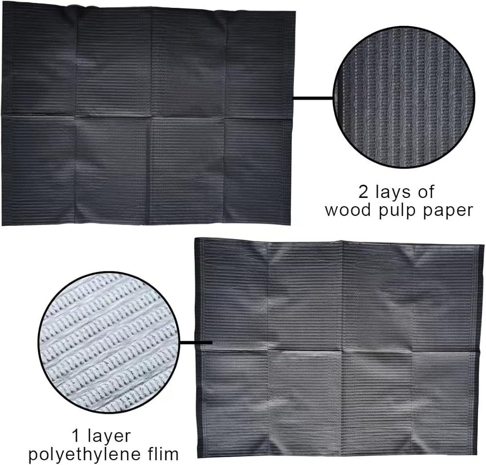 【Waterproof Bibs】 Composed of 2 ply tissues and 1 ply polyethylene film backing, 2 ply water-absorbent tissues will help in absorbing liquid and avoiding spills, 1 ply poly film provides an optimal liquid barrier.
