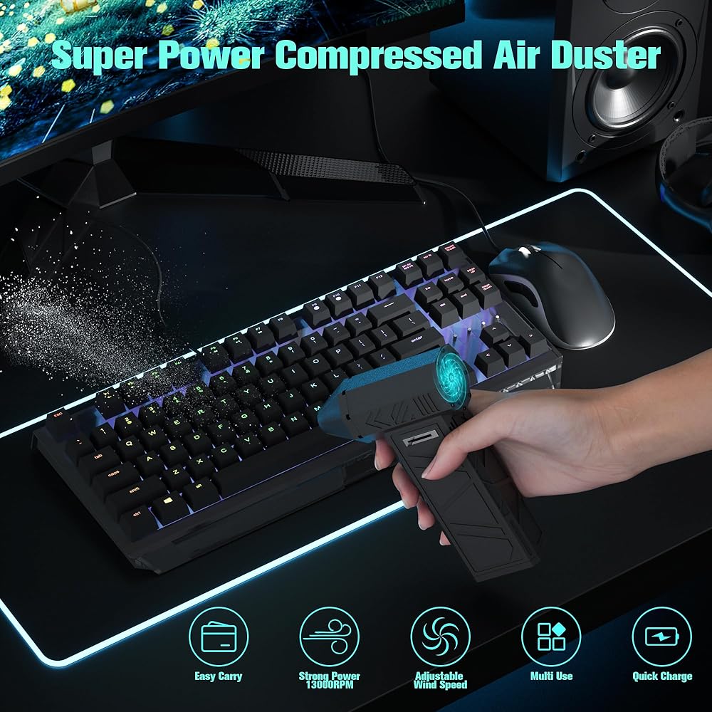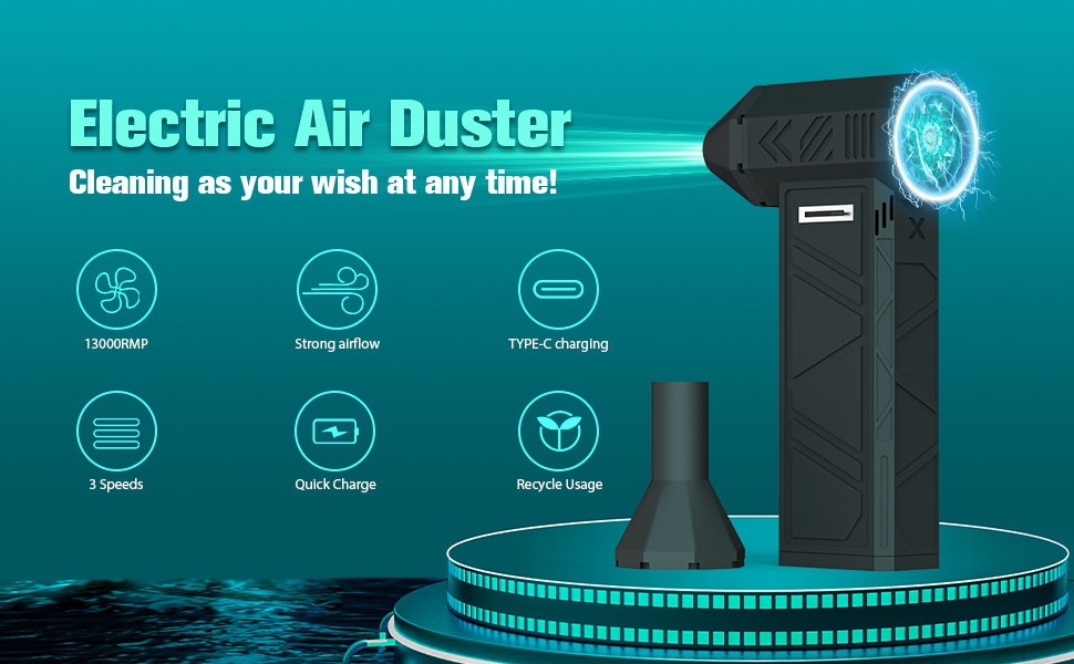 【RECYCLE USAGE & ENVIRONMENTAL PROTECTION】- Compared to compressed air can, our electric air duster can be recharged and used repeatedly. It is more energy efficient, environmentally friendly and saves money than constantly buying canned air. The compressed air duster do not produce chemicals, liquids or ice during cleaning. The electric air duster protects your electronics from liquids. The compressed air duster is a one-time investment, you can have a permanent electric dust blower.
