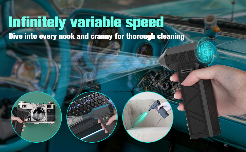 【130000RPM COMPRESSED AIR DUSTER】 - The maximum rotate speed of the compressed air duster is 130,000 RPM and Wind pressure 185 grams. Maximum wind speed exceeds 52 m/s (super typhoon ≥51 m/s). The compressed air duster provides continuous high pressure air to remove dust. The compressed air duster produces super-strong air currents that can remove debris and dust from any electronic device. You can put the compressed air duster in your home, office or car.