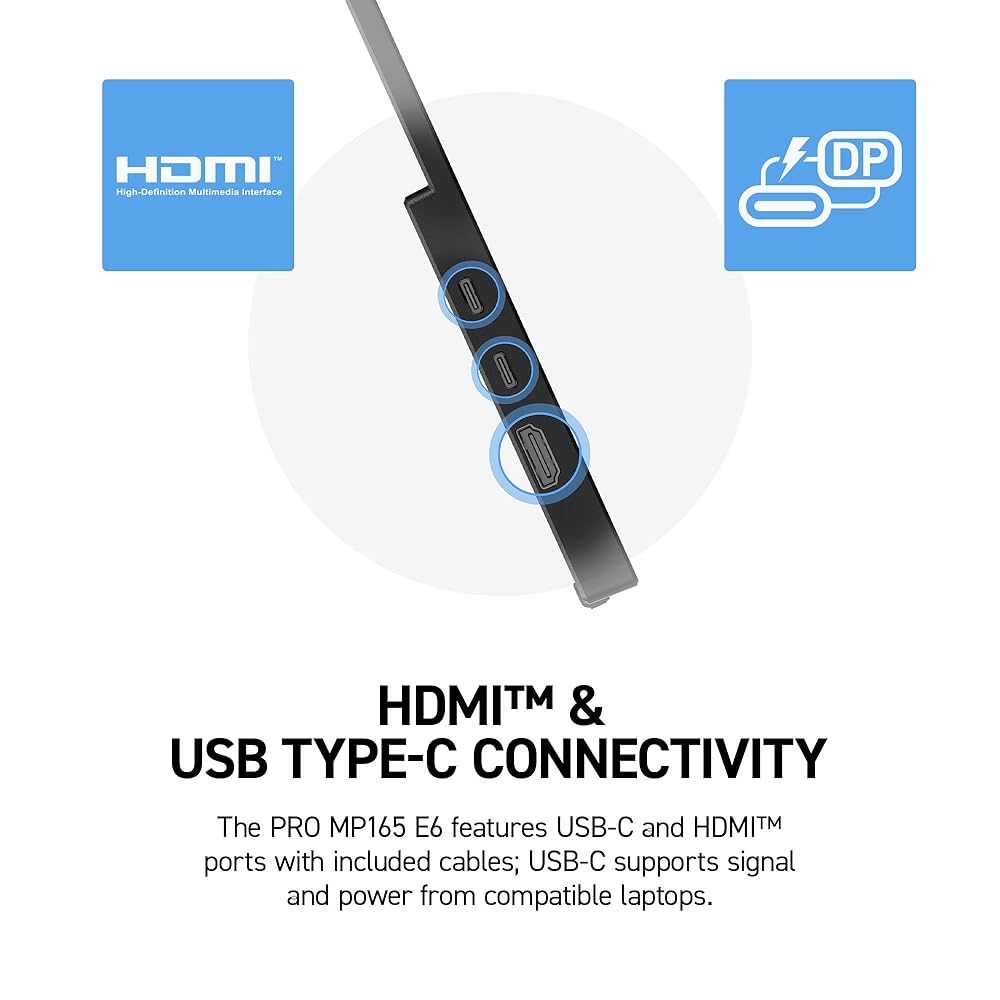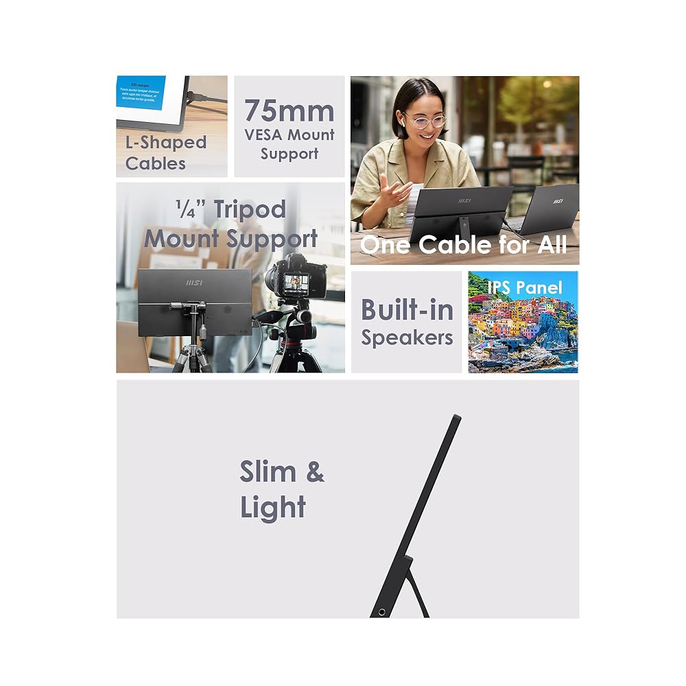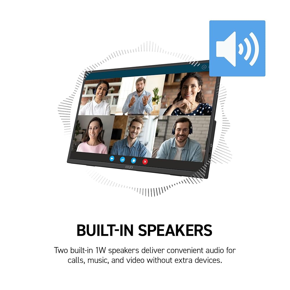 The MSI PRO MP161 E2 portable monitor features a sharp 15.6"" Full HD (1920 x 1080) IPS panel with eye-friendly technology and an ergonomic fold-out kickstand that supports both horizontal and vertical display orientations. Designed to improve work productivity for anyone on the go, the monitor features a 60Hz refresh rate (4ms GtG response time) and multiple eye-friendly features, including TÜV Rheinland Eye Comfort certified Less Blue Light and anti-flicker technology, as well as anti-glare screen finishing to reduce eye strain. Additional quality features include a 0° ~ 180° lengthened fold-out kickstand designed to support both portrait or landscape formats, 1/4-inch tripod mount support, dual built-in 1.5W speakers for conference calls, L-shaped cable plugs for secure wired connections, and Display Kit App support for advanced colour & display settings. Connectivity options include mini-HDMI 2.0b and dual USB Type-C ports for versatile device support. Compatible with PC, Mac, laptop, and mobile devices.