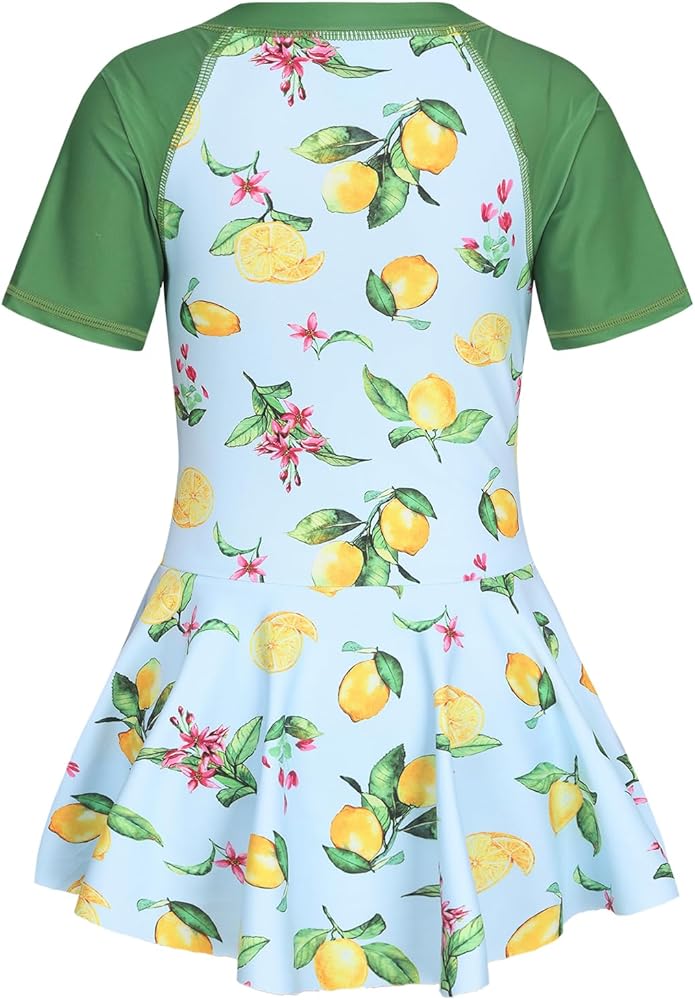 Girls One Piece Swimsuits Hawaiian Skirted Bathing Suit for Kids Grils Summer Swim Dress Short Sleeve Swimwear 3-16 years
