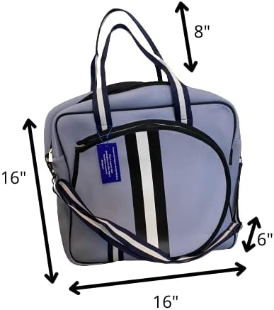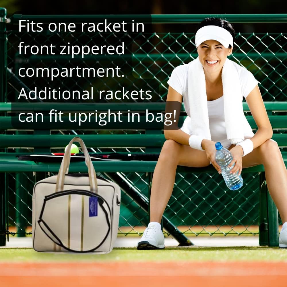 PLAYER APPROVED One racket fits in the front zippered compartment. Large capacity interior includes one zip pocket for personals, a netted pocket that runs length of bag, space for shoes, and two additional pockets perfect for a water bottle and balls. Additional rackets can fit upright in bag. Tote has a top zipper closure. Lightweight bag is ideally suited for tennis, pickleball, paddle, squash, racquetball, and badminton.