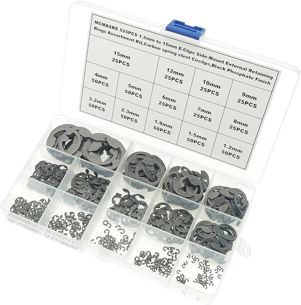 These Metric E-Clips Kit 10 various sizes contains: 1.2mm(50PCS),1.5mm(50PCS), 1.9mm(50PCS),2.3mm(50PCS),3.2mm(50PCS),4mm(50PCS),5mm(50PCS),6mm(25PCS),7mm(25PCS),8mm(25PCS),9mm(25PCS),10mm(25PCS),12mm(25PCS),15mm(25PCS);Total 525pieces