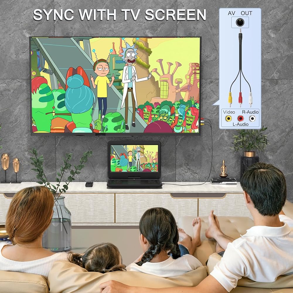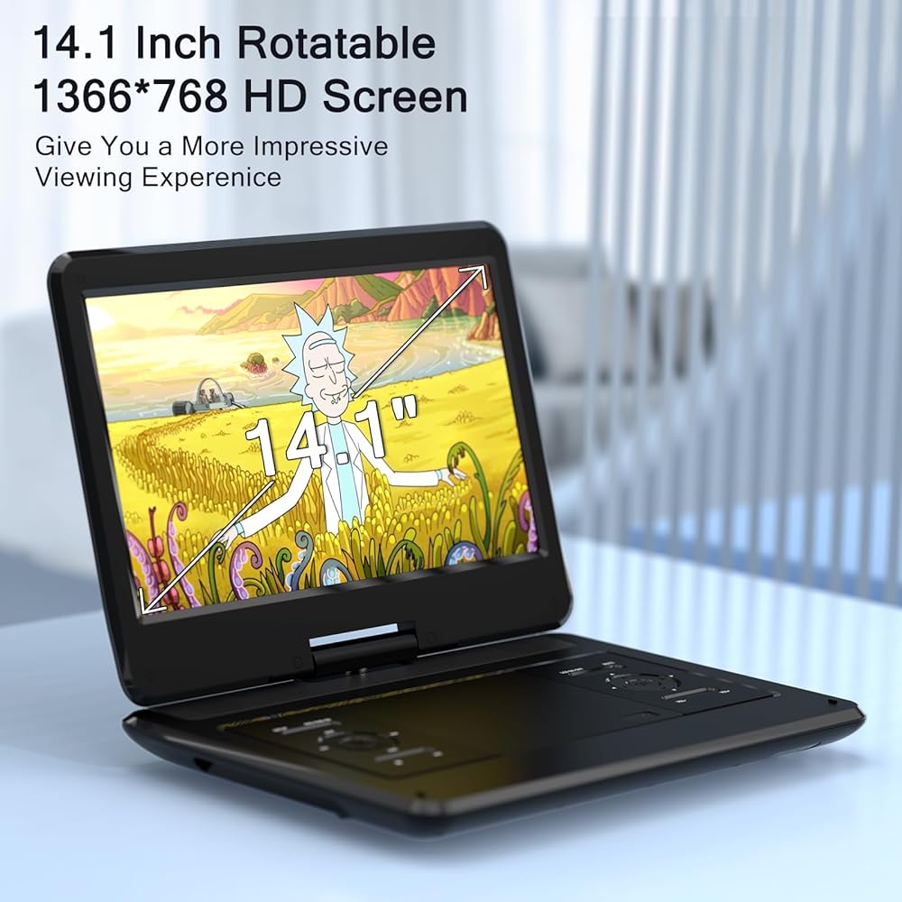 High Resolution Screen -- WSJSYH portable DVD player adopts 14.1 Inch 1366*768 HD swivel screen. Upgraded screen can relieve visual fatigue caused by long-term viewing. Thanks to 270° rotation and 180° flip feature, it provides an extreme viewing experience and easy positioning.