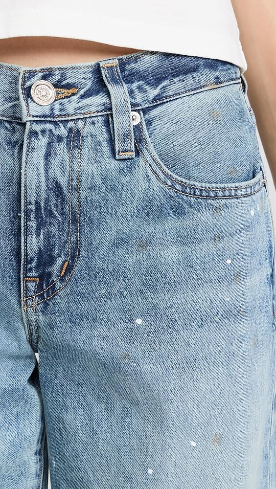Fading and whiskering, Light distressing, Paint splatter print throughout