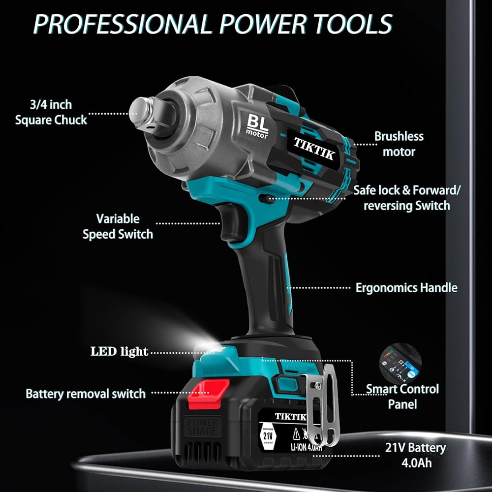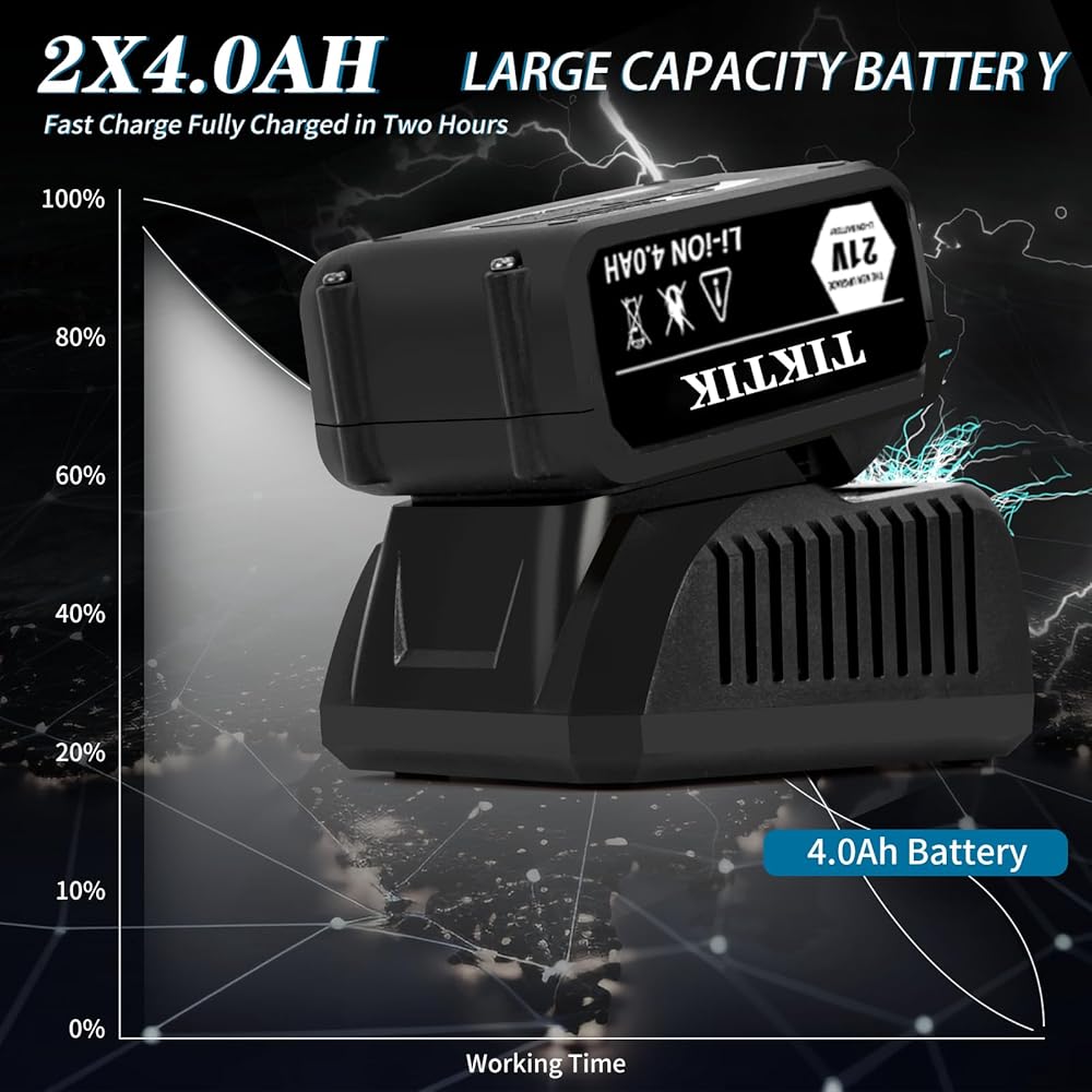🔧 2*4.0Ah BATTERY AND QUICK CHARGER-The biggest problem with electric impact wrenches is the battery power, but you don't have to worry about this one because we equip you with 2 x 4.0Ah batteries, so whether you are using it at home or going out to work, it's the preferred partner for you, and it's powerful enough to support your working time, in addition to that, electric wrenches also give you a quick charger with it It has enough power to support your working time, besides, the electric wrench also gives you a quick charger, which greatly improves the working efficiency.