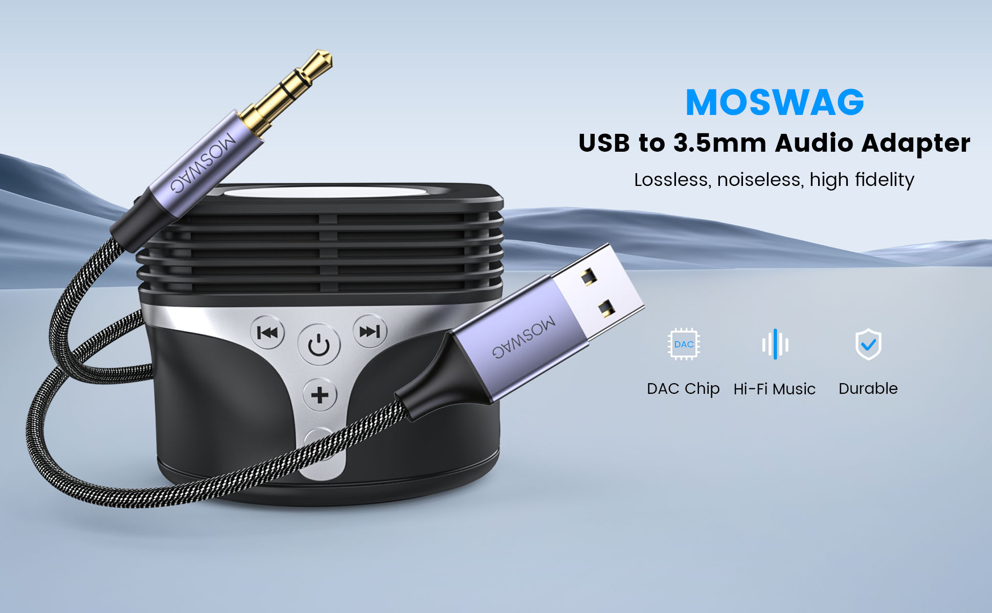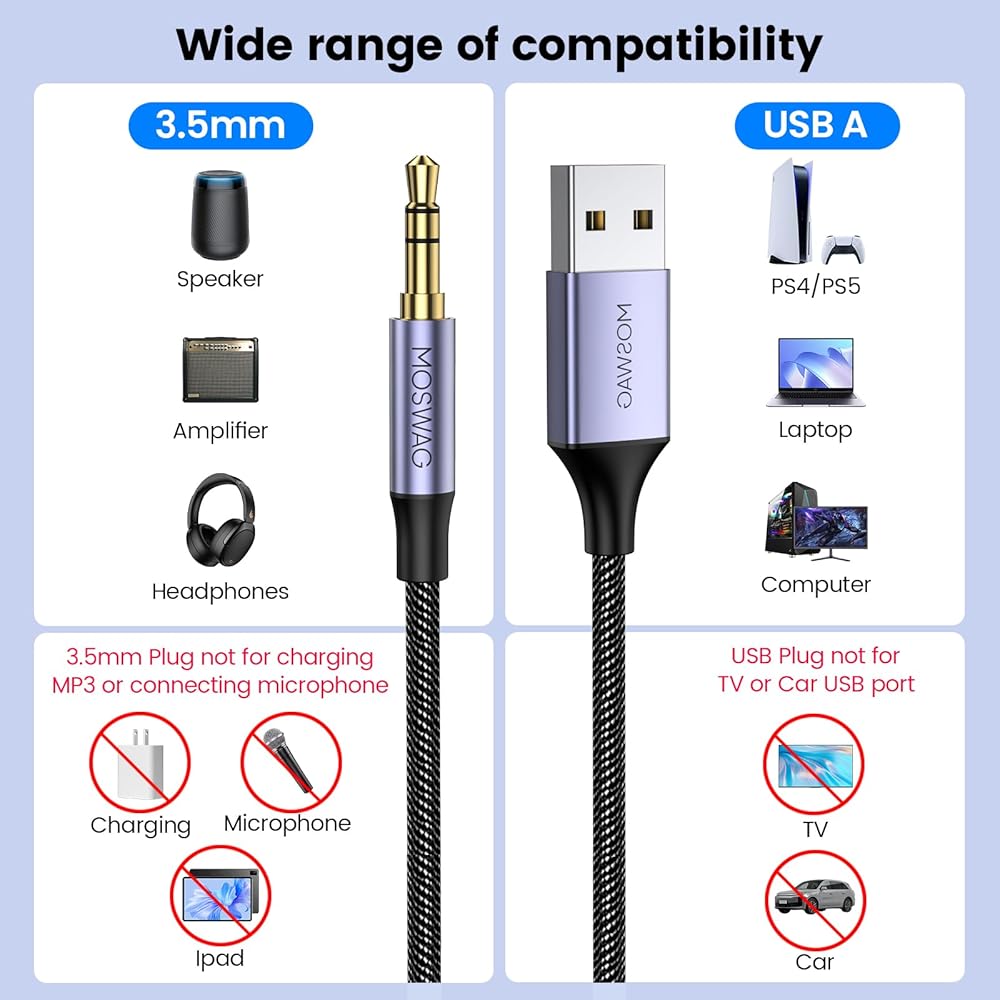 MOSWAG USB to 3.5mm TRS Audio Jack Adapter, USB Male to 3.5mm AUX Stereo Audio Cable, Nylon Braided AUX Converter for PC, Laptop, Windows, Mac OSX, Headphones(Does not Support Car, Mic and Charging)