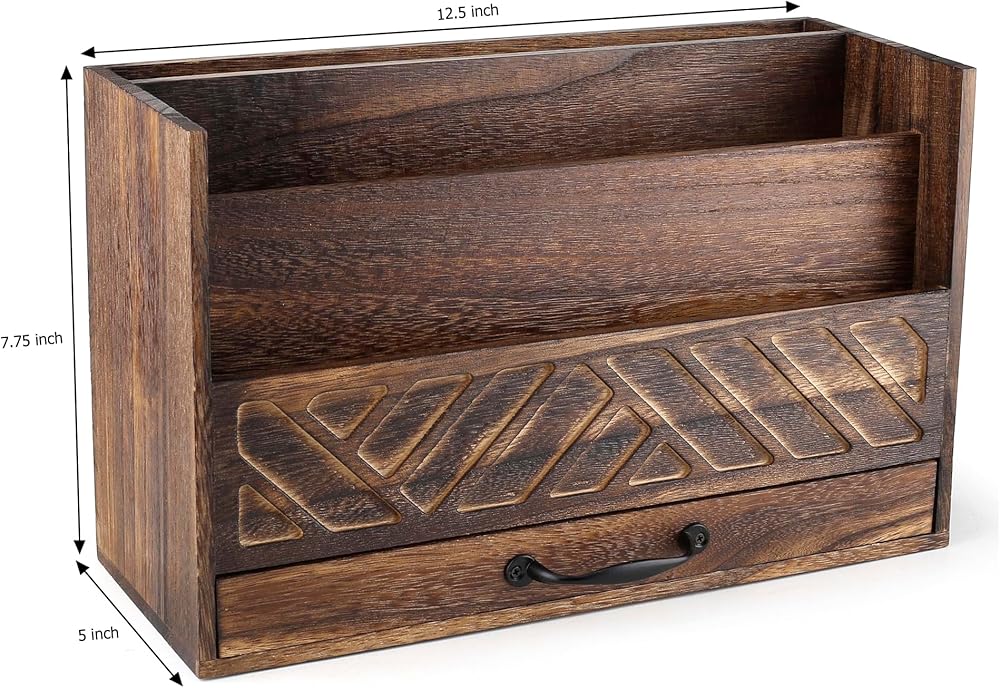 Wood Office Desk Organizers and Storage, Wood Mail Bill Organizer with Drawer for Desktop Organization, Desk Accessories & Workspace Organizers, File Paper Holder Desk Sorter for Storage(Rustic Brown)
