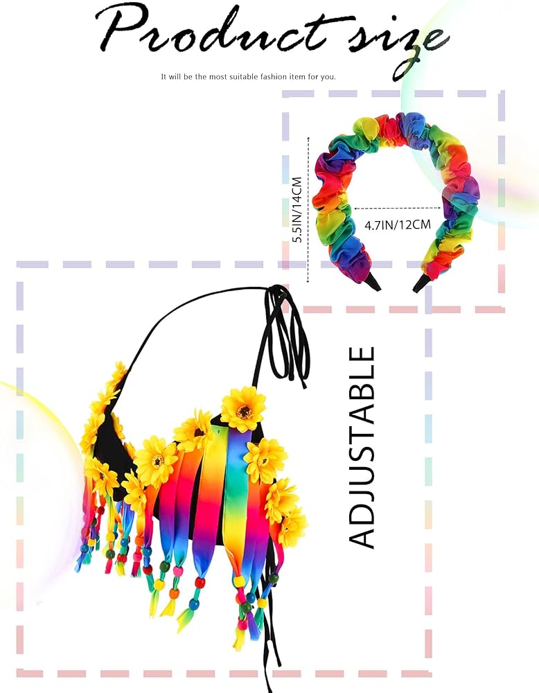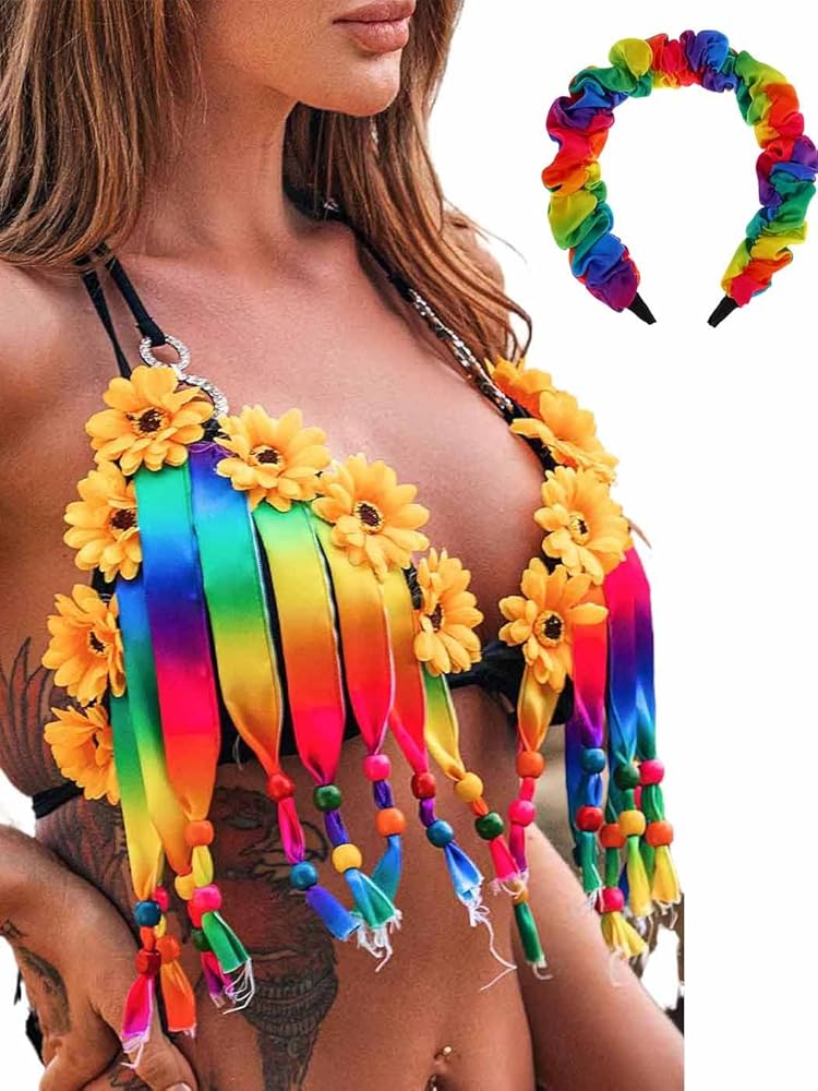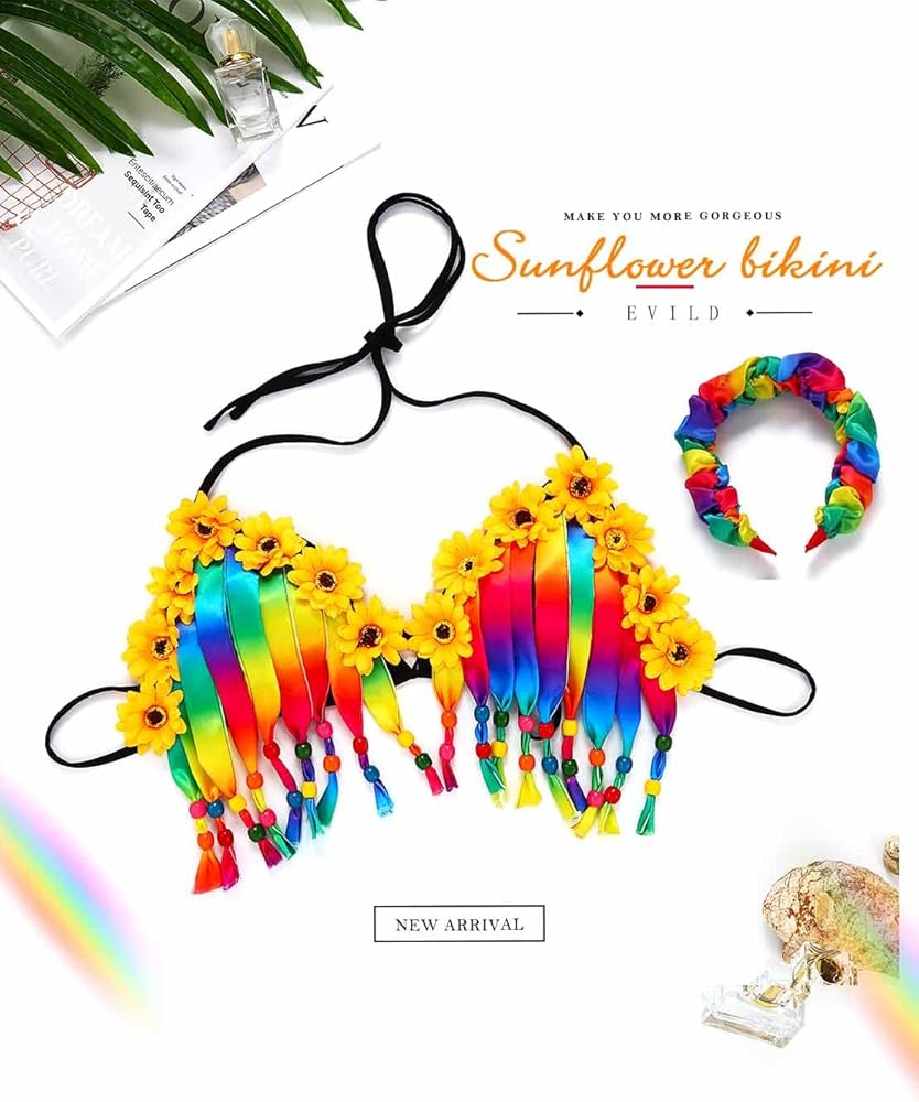 Festival rainbow bikini is speacial top,The edges of the bra are adorned with more than a dozen sunflowers, and the overall design is rendered with rainbow tassels, making a regular bra look bright and eye-catching.